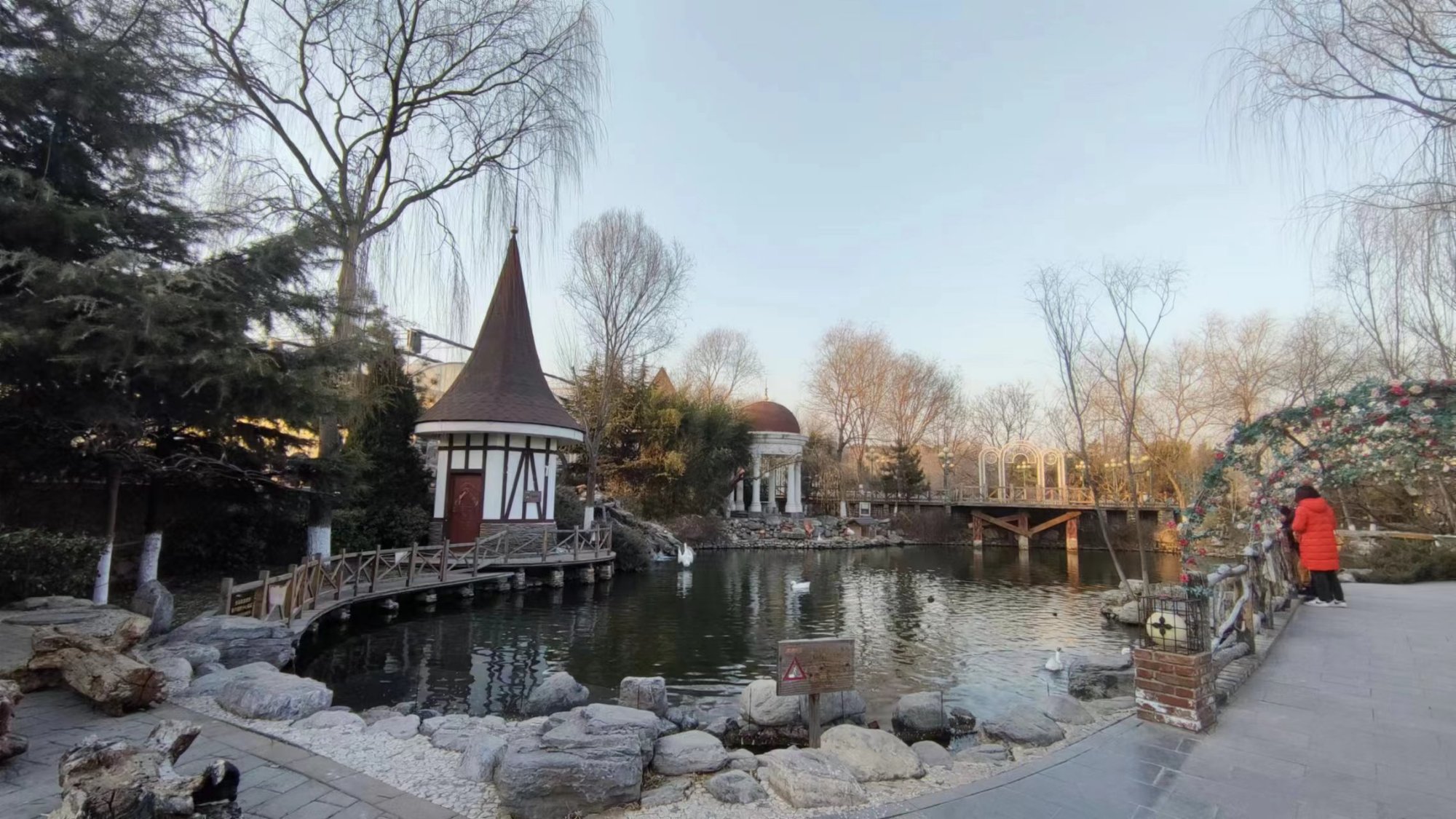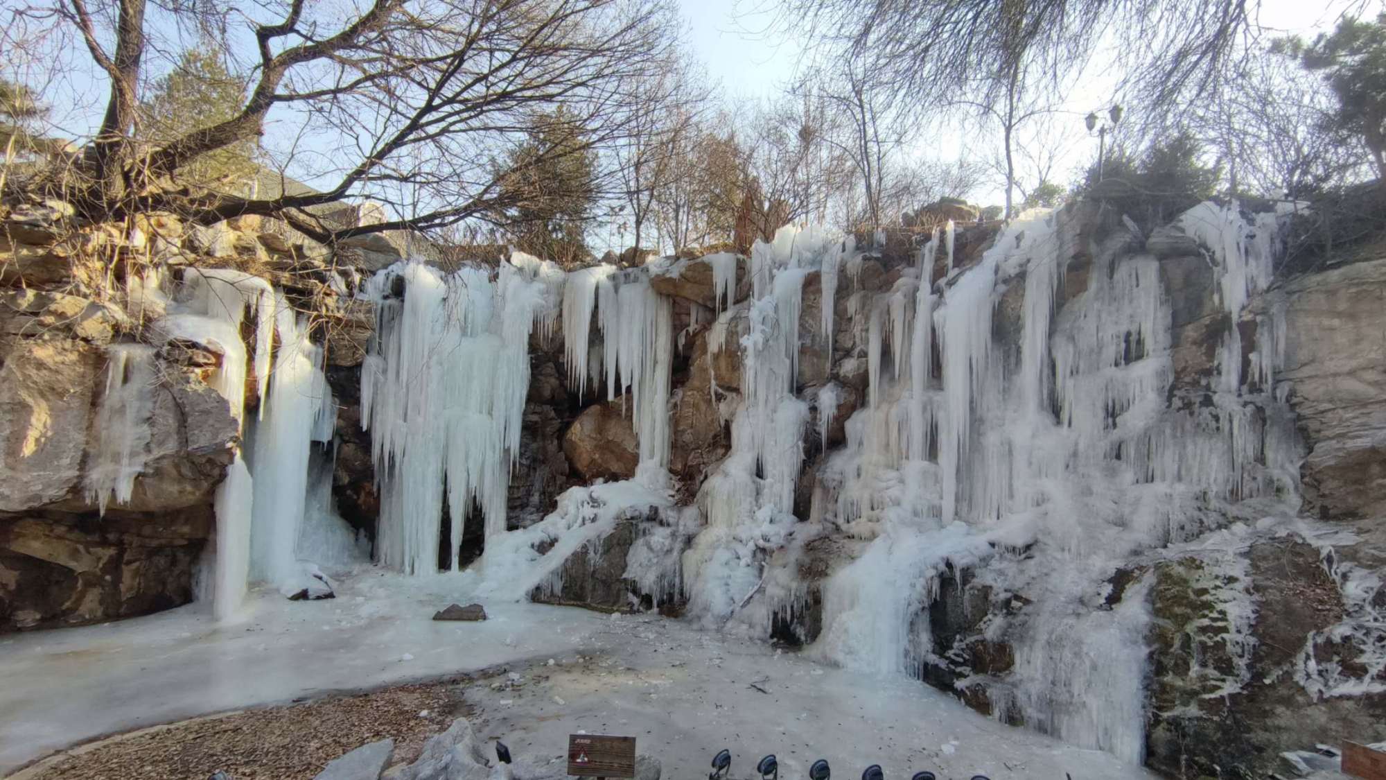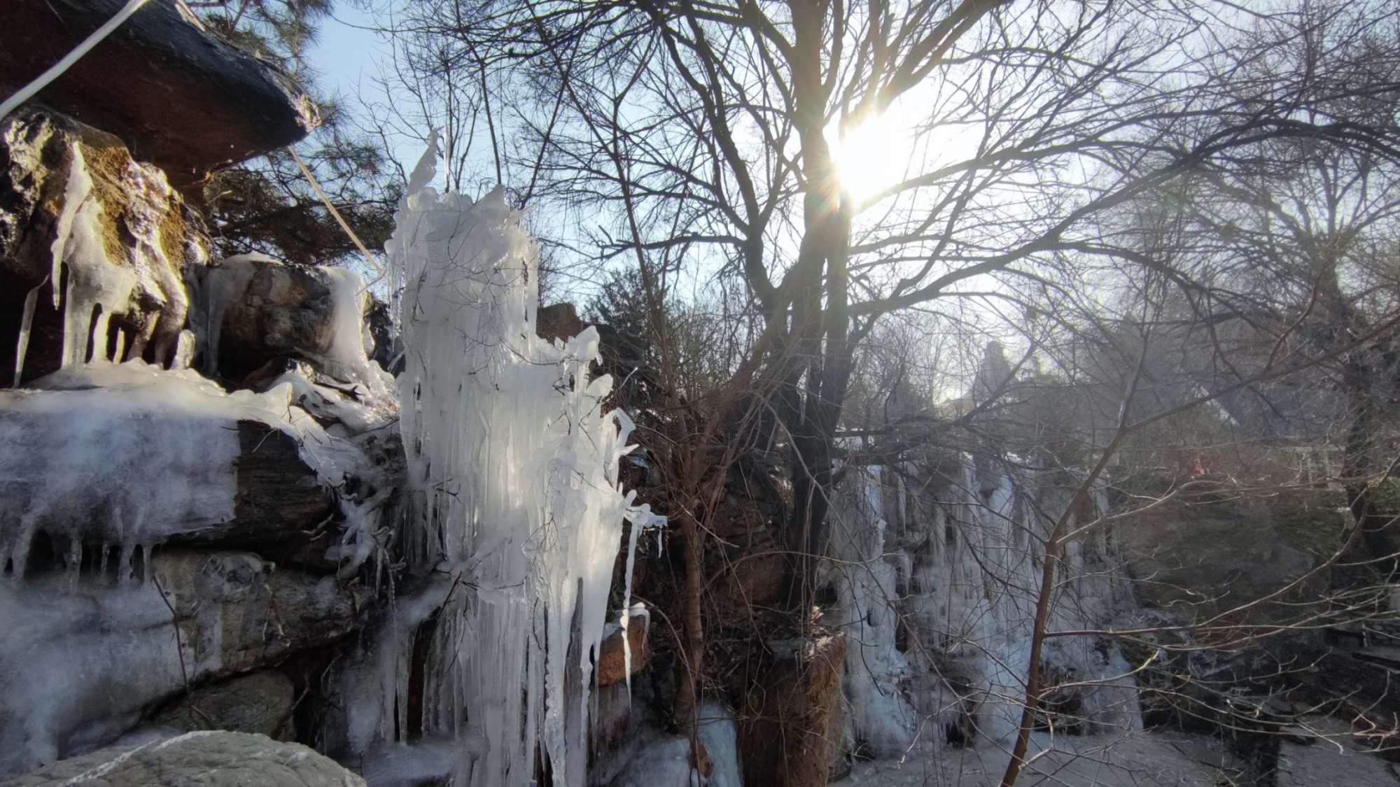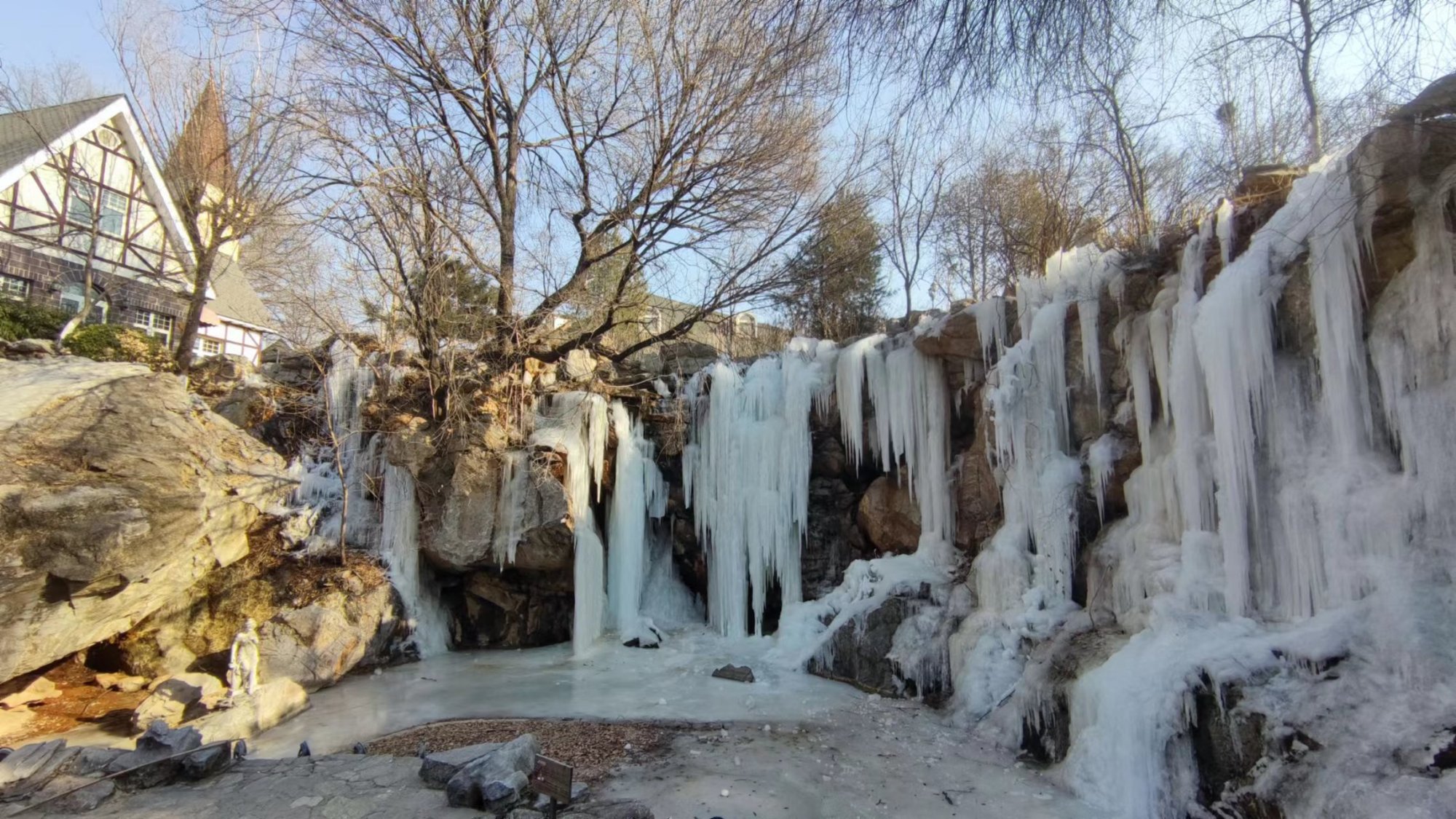 冬日,在房山天毓山庄内,泉水流经的石壁上凝成洁白的冰瀑,在阳光的映照下晶莹如玉。冰凌玲珑剔透,水帘层层叠叠,置身其中,宛如现实版的童话世界,让人不禁感叹大自然的鬼斧神工!