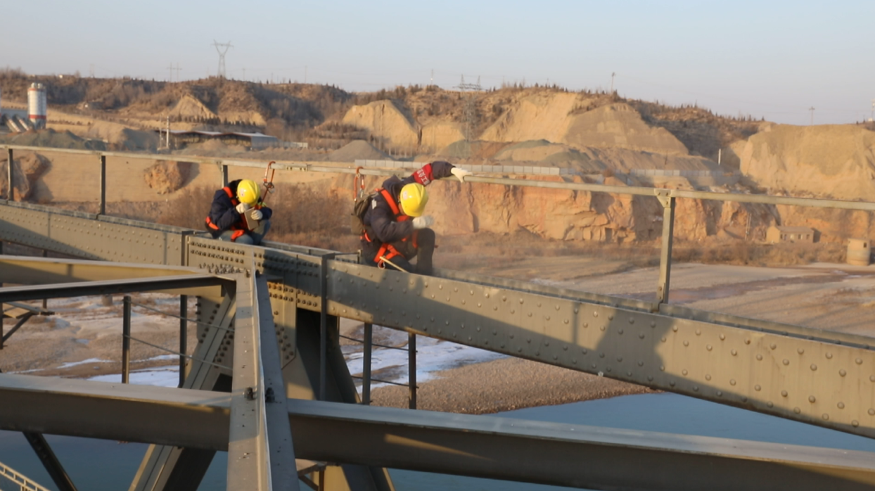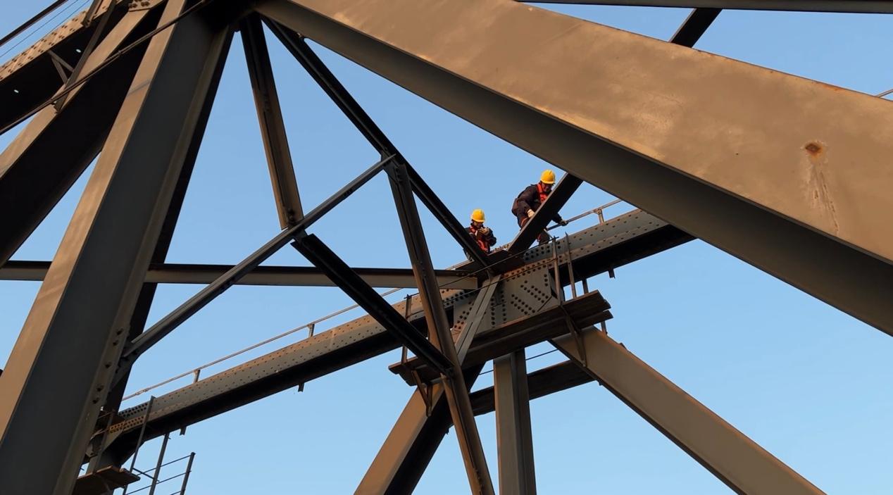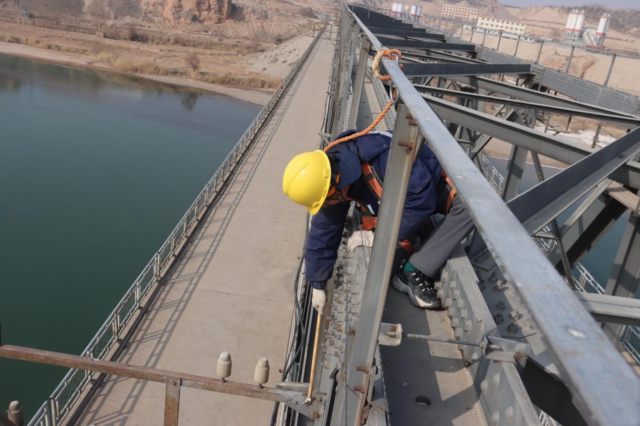 太阳当头,到了下午,铁桥上的薄霜完全消散。56岁的工区“老大哥”白登明,带着徒弟刘昕攀上了桥顶。从巡检车往下看,是深不见底的黄河水;透过桥缝里往上看,师徒在距离河面约三十米的桥梁顶部探身检查。