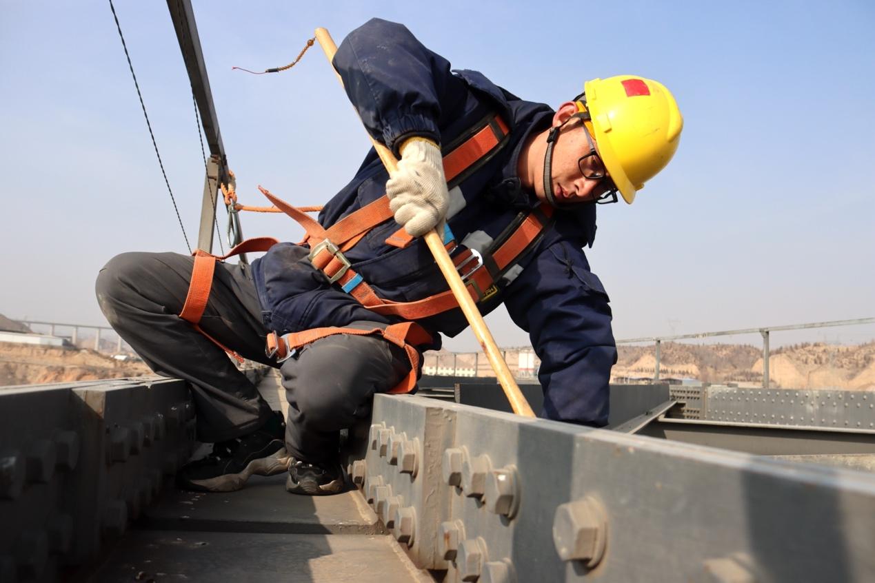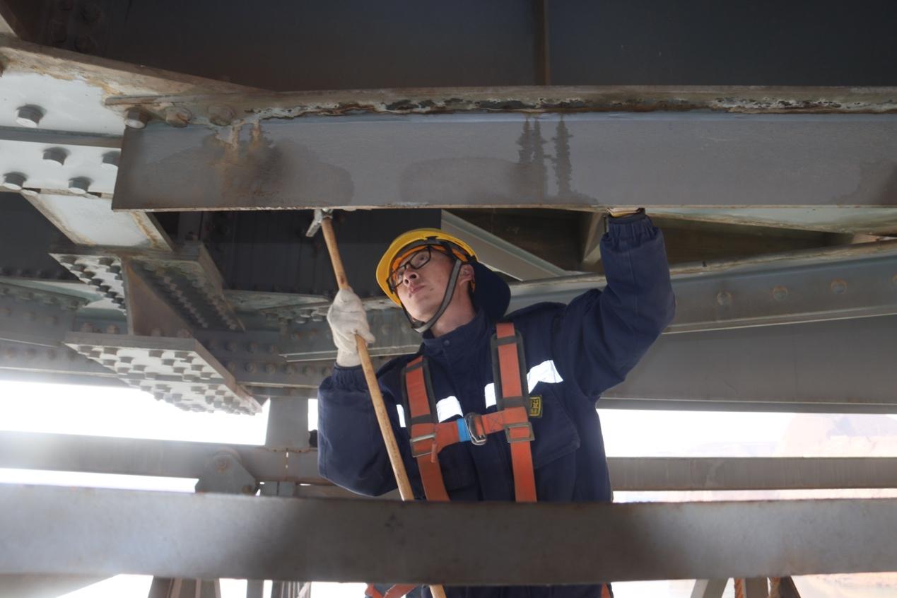 刘昕正在检查桥上的高强度螺栓