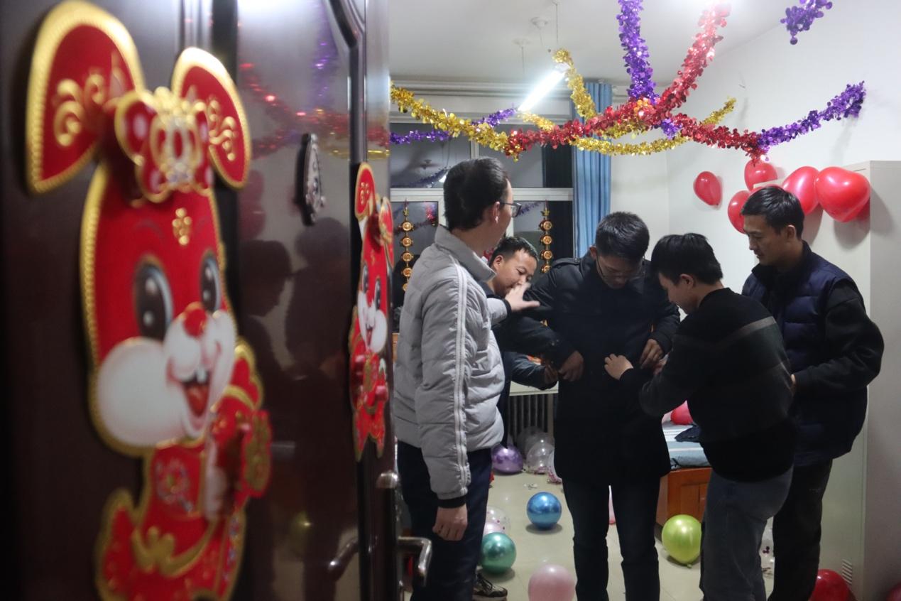 回到宿舍,吹气球、挂彩带、布置房间,大伙儿帮着詹生龙把衣服抹平整。