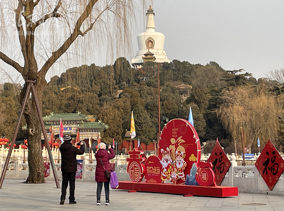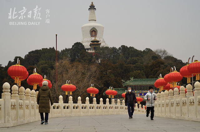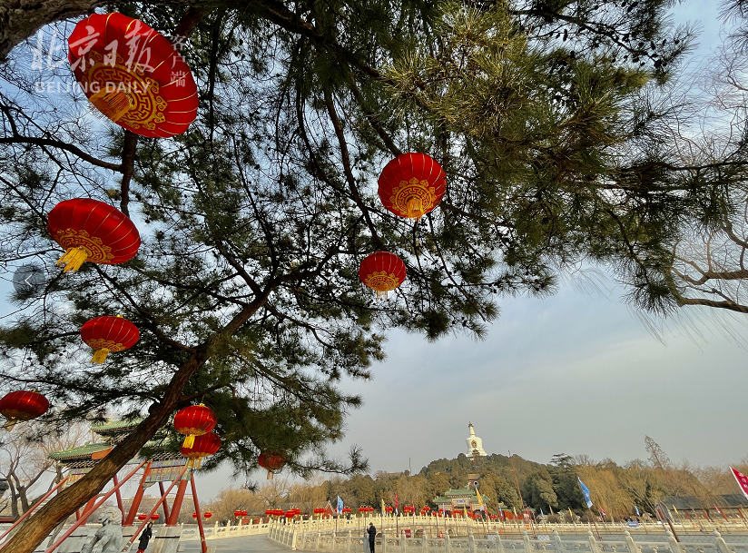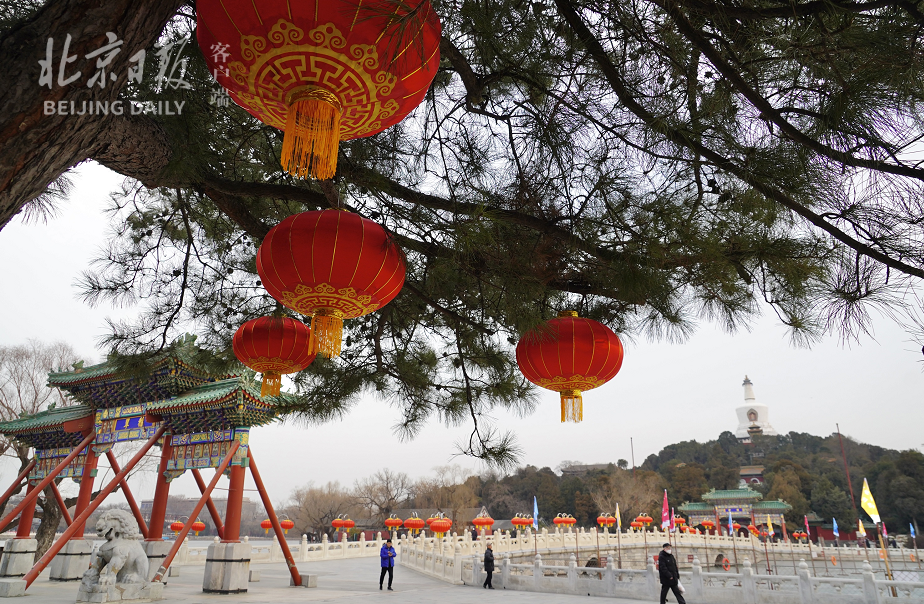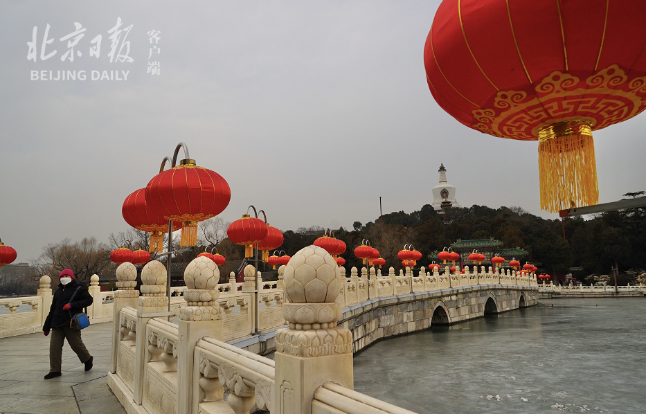 兔年春节在即,北海公园永安桥大红灯笼映白塔