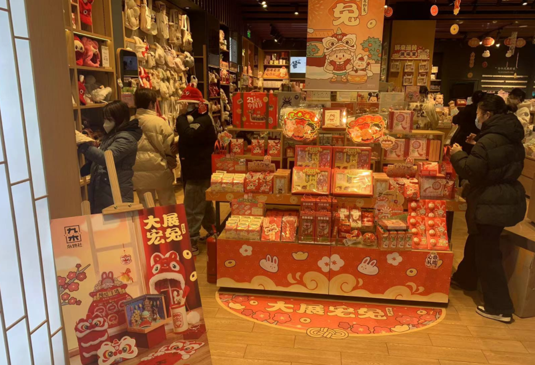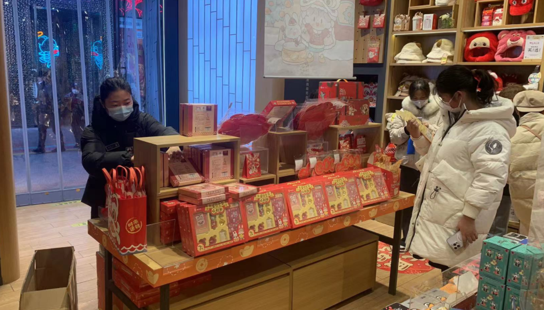 在华熙LIVE·五棵松内的九木杂物社,在门外隔着卷帘就能看到店内柜台上火红一片,各式各样的春节小饰品和小礼物让不少市民忍不住上手仔细挑选。“这个怎么样?好看吗?”一旁的工作人员不停打开一个个纸箱子,将小礼物摆上柜台。“我们这边的新春礼物在元旦后就陆续上线了,基本都是年轻人在买,过两天估计买的人更多。”工作人员说。