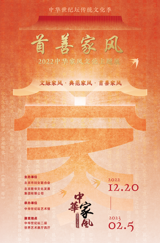 “首善家风——2022年中华家风文化主题展”由北京市妇女联合会、北京歌华文化发展集团有限公司主办,中华世纪坛艺术馆承办。
