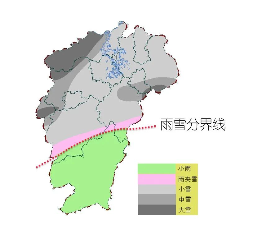 此次强寒潮天气雨雪相态转换的时间节点出现在14日后半夜。江西西北部的九江市和宜春市西北部率先转雨夹雪。伴随冷平流的加强,15日白天到晚上赣北、赣中地区将转雨夹雪或小雪,部分地区有中雪,局部地区有大雪,雨雪分界线就在赣中、赣南的交界处。