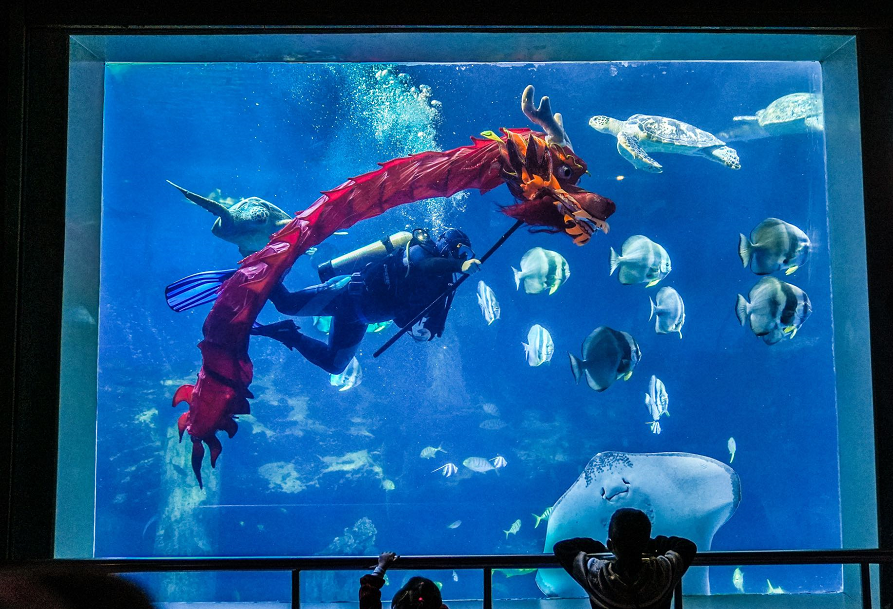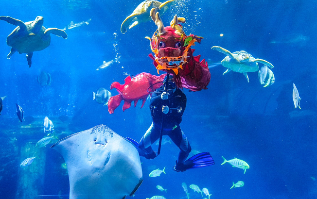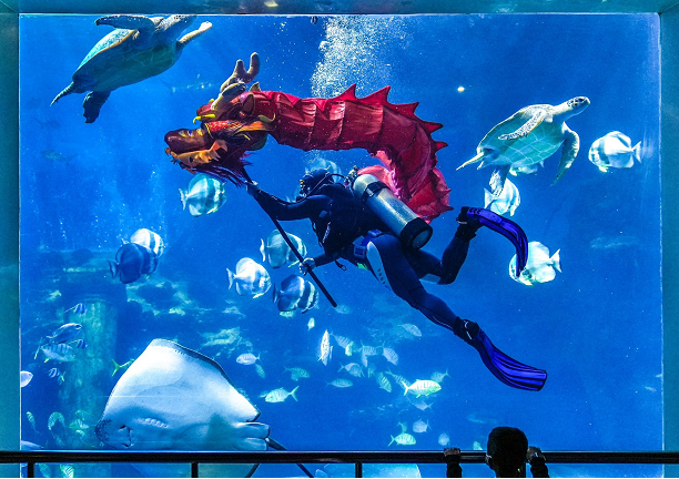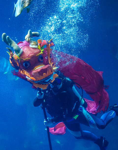 表演将中国的新年特色舞龙和潜水技能合二为一。演出者需要在深达7米的表演区域灵活舞动长2.5米的祥龙道具,克服水压、深水阻力、表演道具沉重等困难,完成一系列动作。