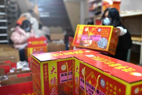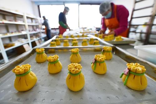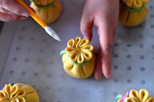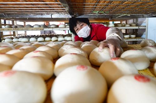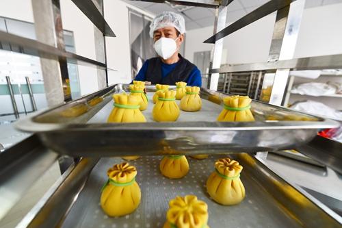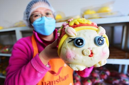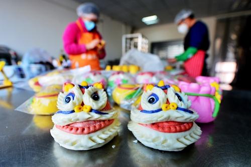 1月10日,在青岛市城阳区流亭街道一家馒头加工企业,工人展示各类非遗面塑饽饽。 春节临近,流亭非遗面塑大馒头热销春节市场。据了解,流亭大馒头距今已有160余年历史,经老底引子、和面、发酵、塑形、蒸制等多道工序制作完成,彩色颜料均采用植物提取汁液,面香浓郁,凝聚着传统手工艺人的匠心味道。