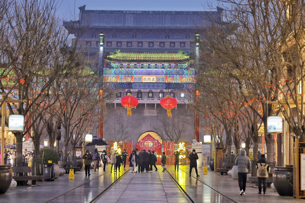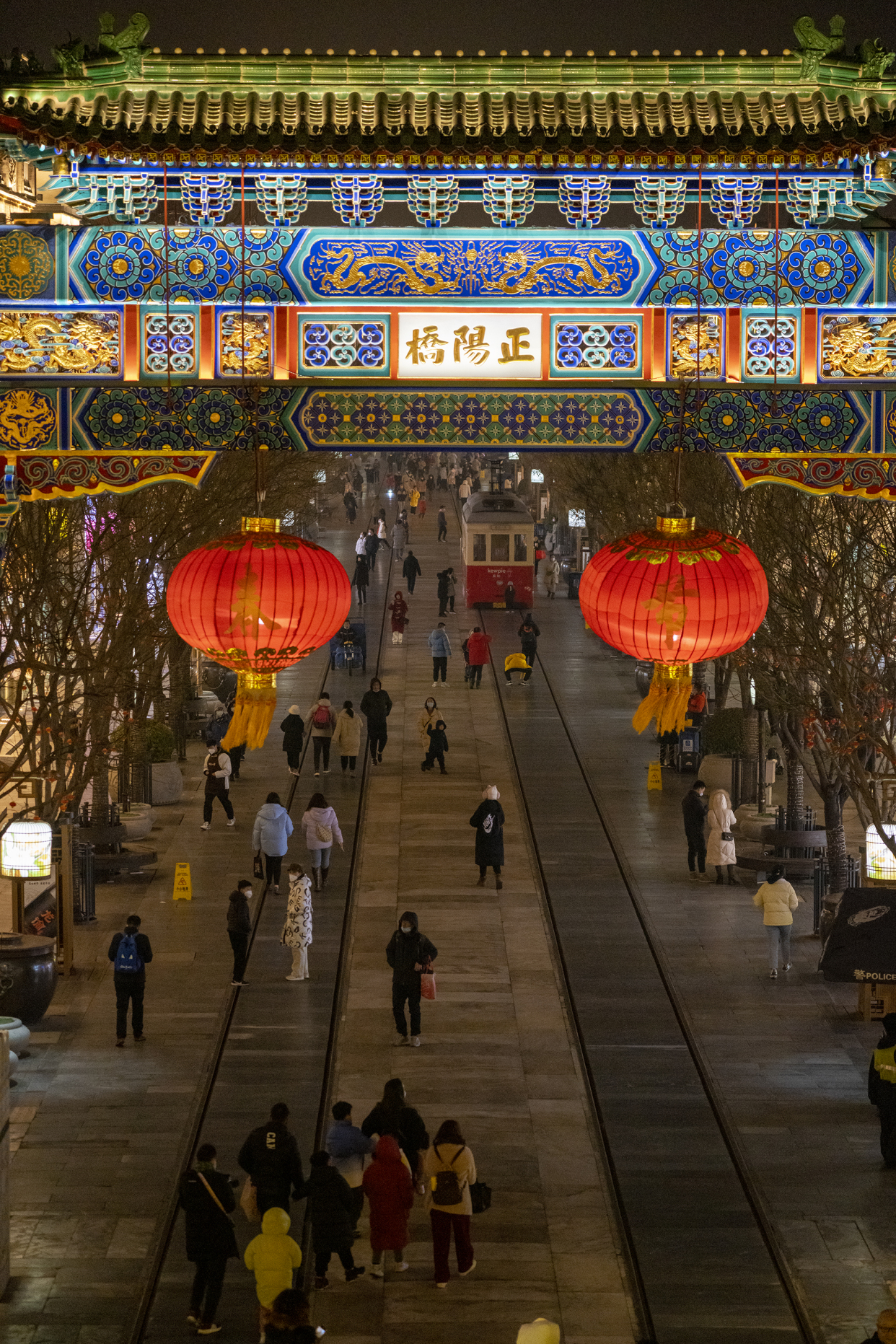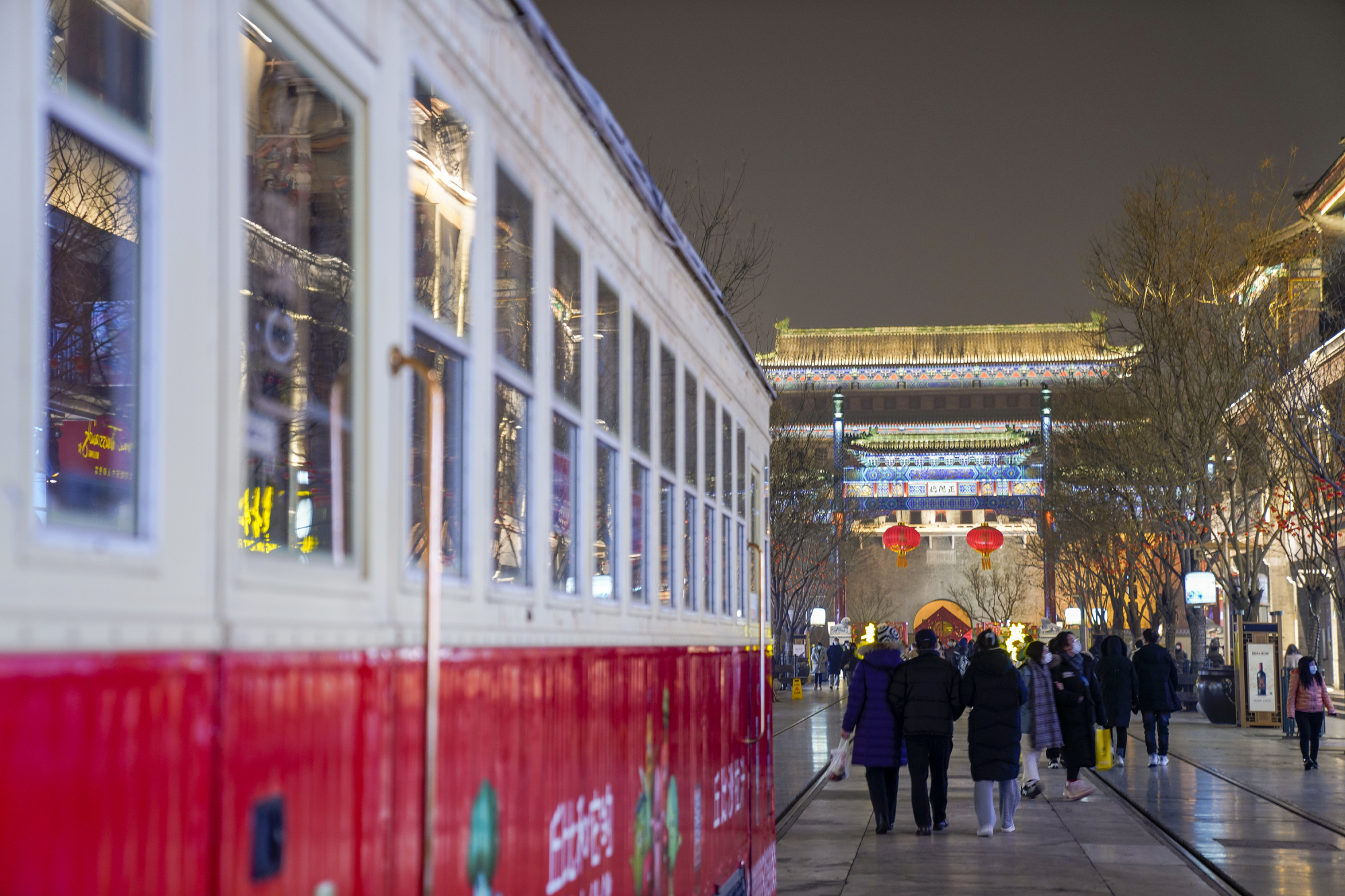 新春将至,年味渐浓。夜色中的前门大街流光溢彩、游人如织。正阳桥牌楼挂上了喜庆的红灯笼,“四方平安”景观小品前市民流连拍照,古色古香的建筑在灯光的映射下愈显迷人……