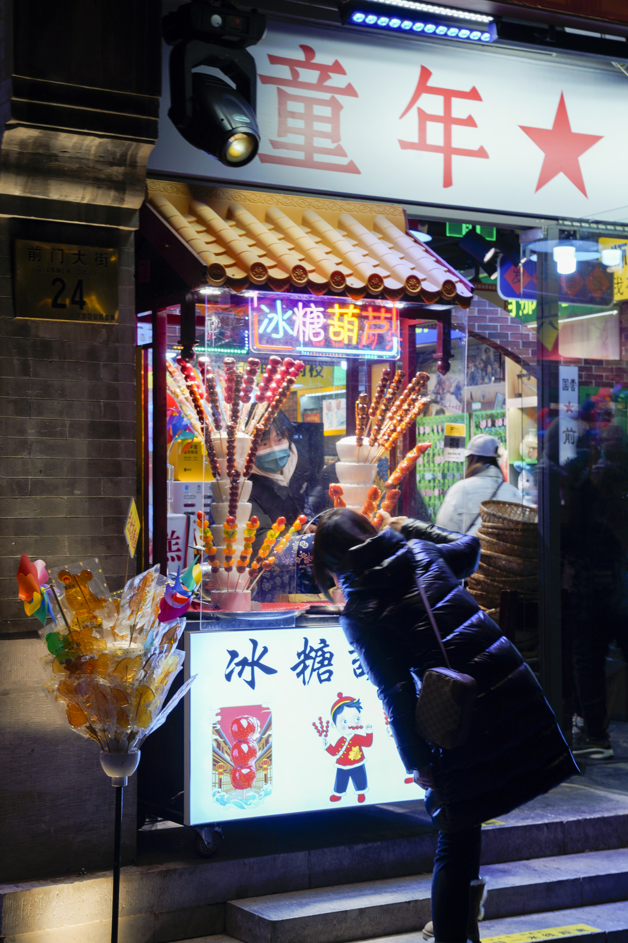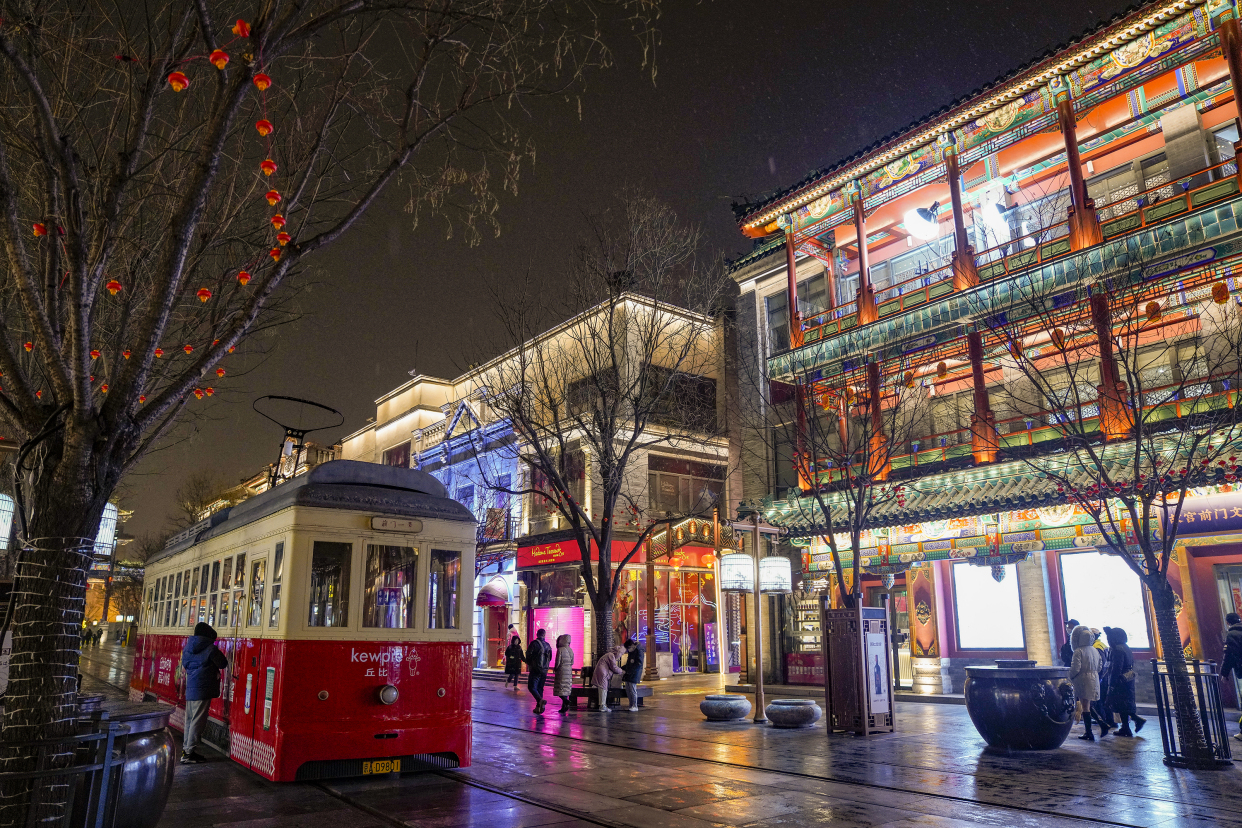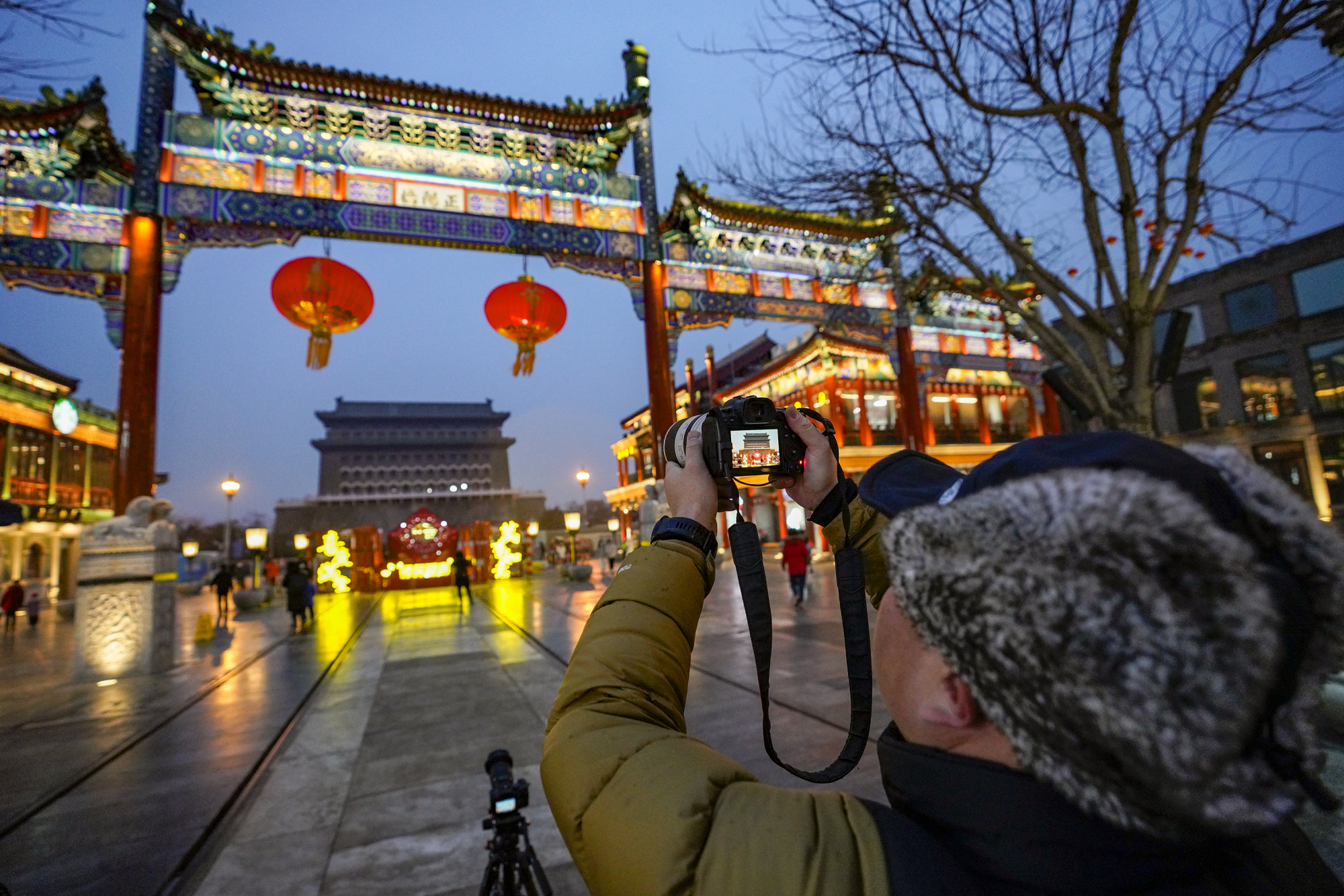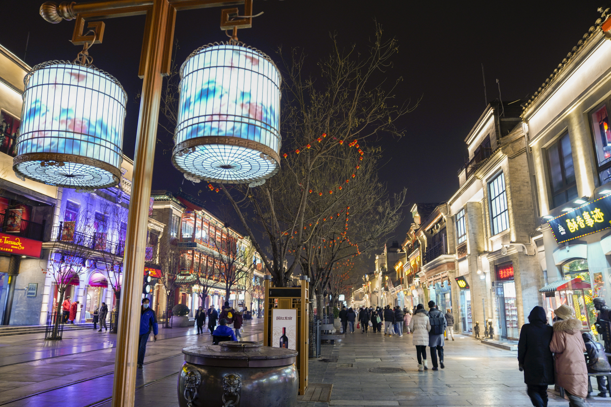 新春将至,年味渐浓。夜色中的前门大街流光溢彩、游人如织。正阳桥牌楼挂上了喜庆的红灯笼,“四方平安”景观小品前市民流连拍照,古色古香的建筑在灯光的映射下愈显迷人……