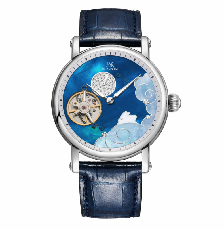 表盘选用贝母材质,以天然晕彩模拟疏朗天空,营造出卯兔于明朗云空中欢跃之态。剑形指针与卯兔均覆有瑞士Super-LumiNova夜光,简洁大气。透过蓝宝石玻璃表镜,可欣赏到表盘上镂空轨道式飞轮转动的震荡之美,邻近的小秒盘满镶水钻,犹如玲珑月阁。而品牌标识则恒定内侧印于12点位,与旋转的表盘盘面交错形成层次感。当表盘缓缓转动,莹润灵兔在卷云间奔跃向黎明。