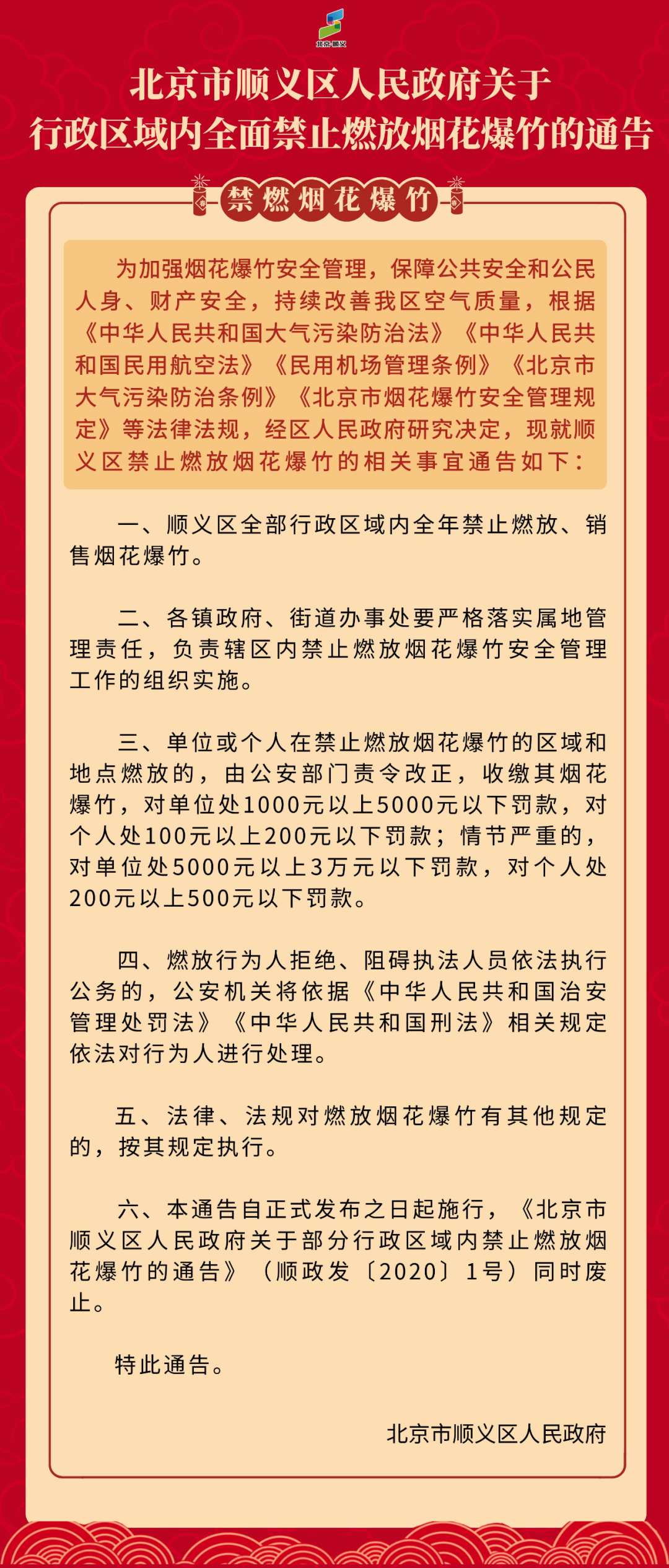 自2022年1月1日起,北京市已实施全域禁放烟花爆竹,今年将继续严格执行全域禁放政策,顺顺在此提示您,顺义区全部行政区域内禁止燃放、销售烟花爆竹,请广大市民自觉遵守烟花爆竹安全管理规定,对燃放、销售、储存、运输烟花爆竹说不,积极响应禁放号召。