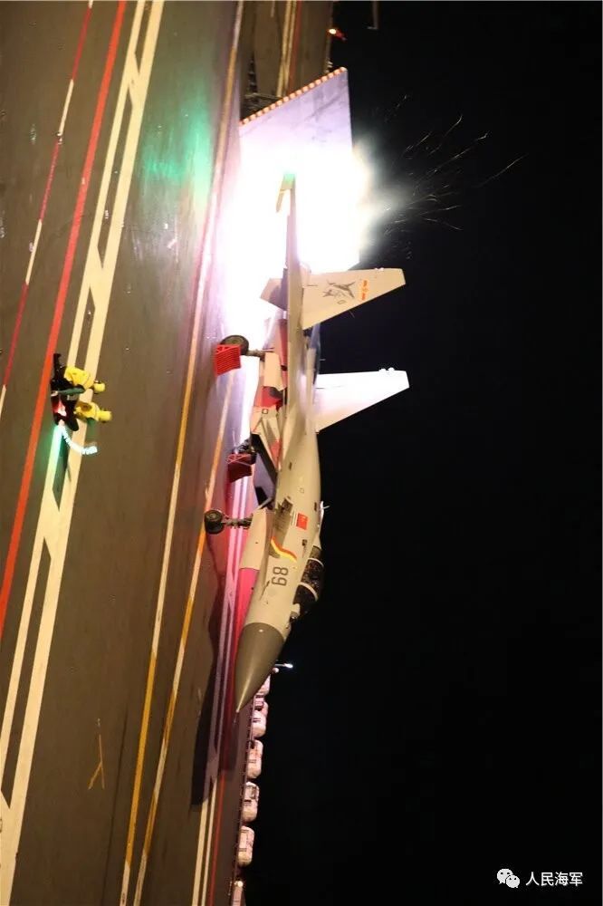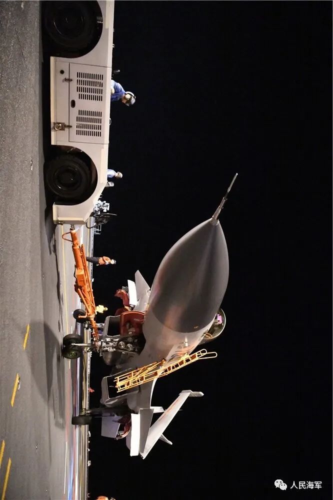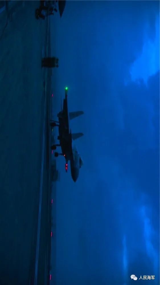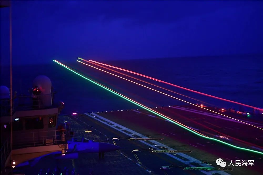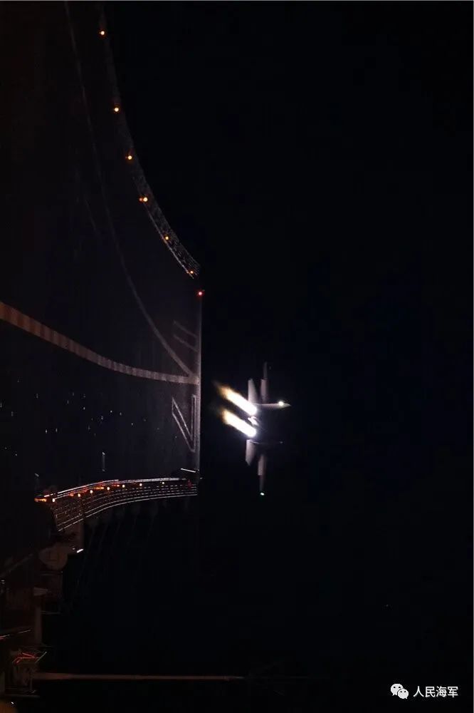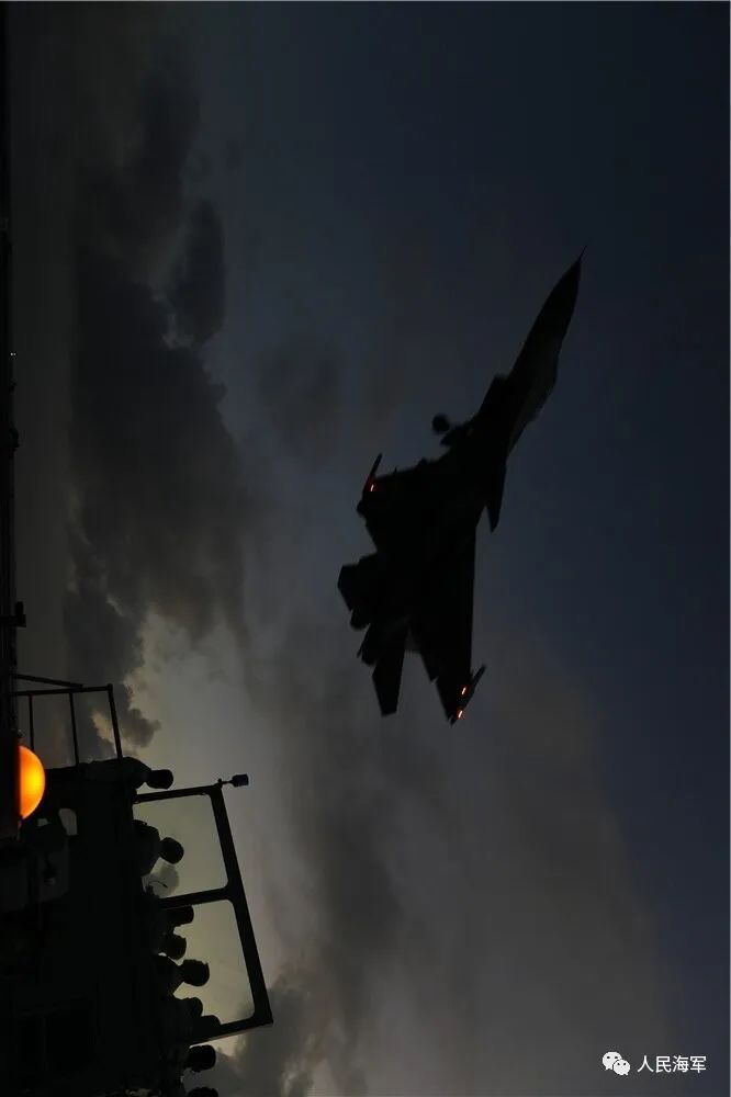 实兵“背靠背”对抗演练结束后,战鹰伴着夕阳陆续返航。加油挂弹、通电检查、惯导对准……山东舰飞行甲板上,舰载机再次出动工作有序进行。星河夜幕下,又一批歼-15战机喷着耀眼的尾焰、伴着巨大的轰鸣呼啸升空……
