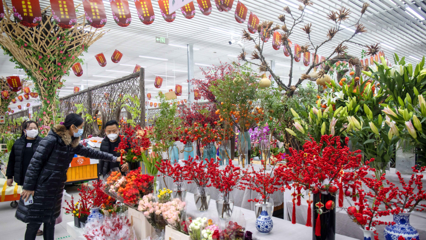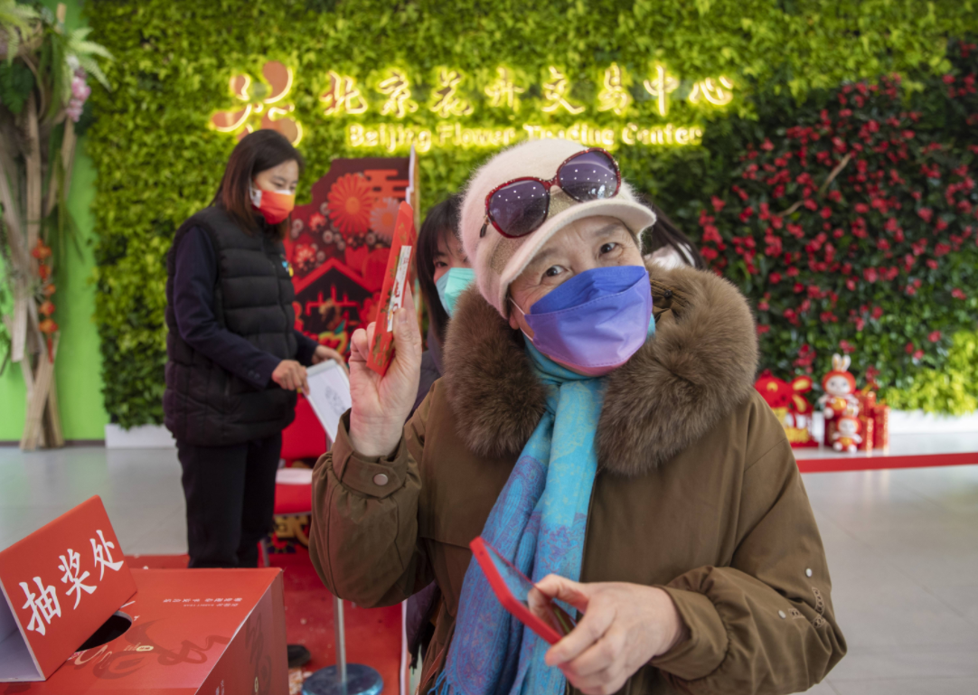 “您好,您在这边扫码,授权登录一下‘北京花卉’小程序,就可以抽奖了。”“中了100元优惠券,今天的手气真好,一会儿就把刚看上的蝴蝶兰买回去!”北京花卉交易中心,花香阵阵,喜庆热闹的节日气氛十足。