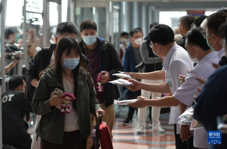1月9日,泰国官员在位于泰国首都曼谷东郊沙没巴干府的素万那普机场欢迎搭乘厦门航空MF833的旅客。新华社发拉亨 摄