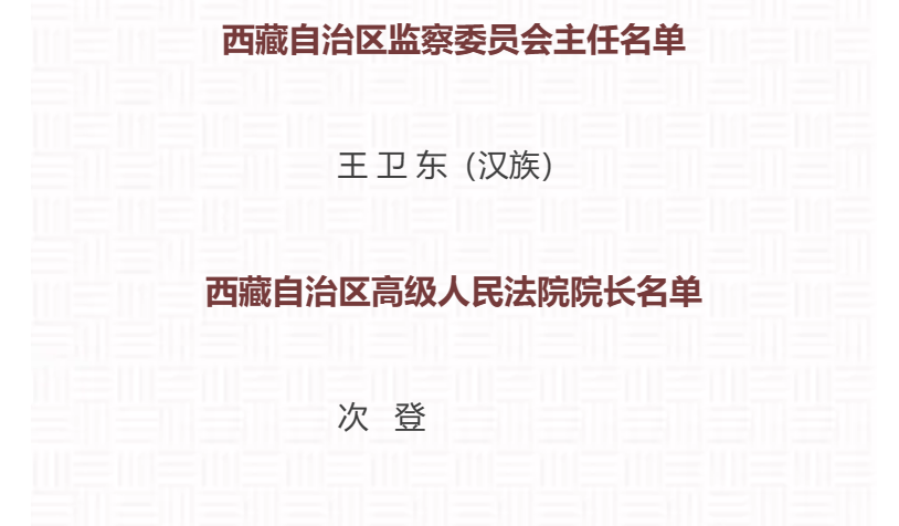 今天上午,自治区十二届人大一次会议举行第三次全体会议,选举西藏自治区第十二届人民代表大会常务委员会主任、副主任、秘书长和委员;选举西藏自治区主席、副主席;选举西藏自治区监察委员会主任;选举西藏自治区高级人民法院院长、西藏自治区人民检察院检察长。