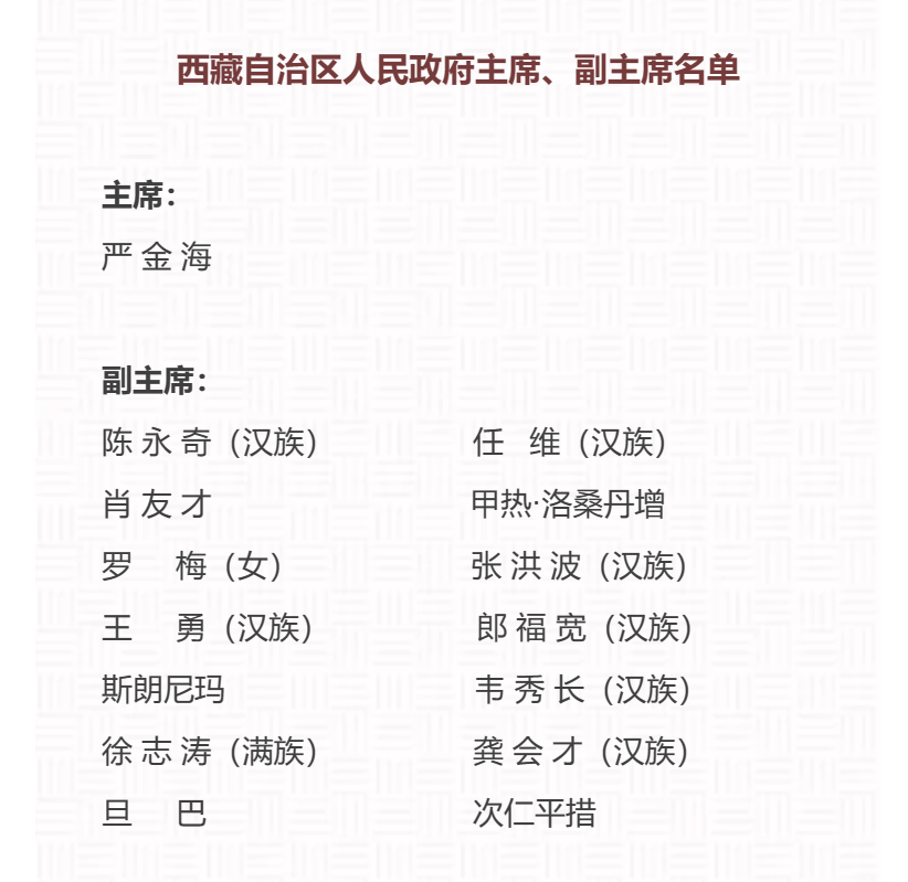 严金海当选西藏自治区人民政府主席。陈永奇、任维、肖友才、甲热•洛桑丹增、罗梅、张洪波、王勇、郎福宽、斯朗尼玛、韦秀长、徐志涛、龚会才、旦巴、次仁平措当选西藏自治区人民政府副主席。王卫东当选西藏自治区监察委员会主任。
