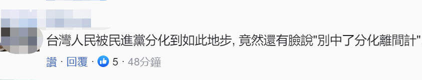 也有网友说,台湾人民被民进党分化到如此地步, 苏贞昌竟然还有脸说“别中了分化离间计”。↓