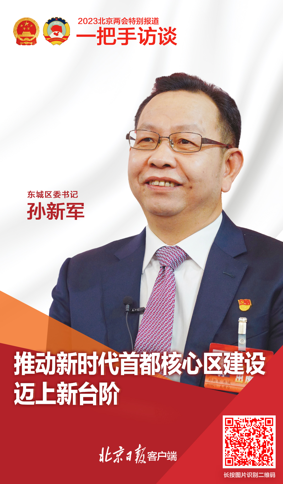 2023年北京市两会期间,市人大代表、东城区委书记孙新军做客北京日报客户端“一把手访谈”节目。今年的主题是“书记故事会”, 孙新军带来一组精美的图片,围绕千年古都、文化名城,与记者分享他最关注的三件事。