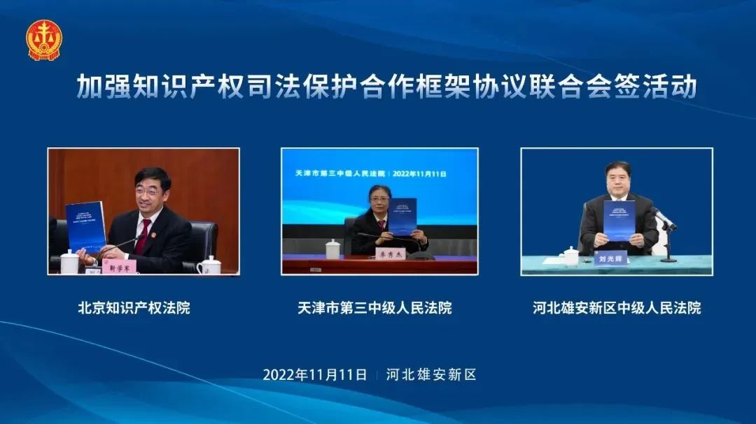 11月11日,北京知识产权法院与天津市第三中级人民法院、河北雄安新区中级人民法院共同签署了《加强知识产权司法保护合作框架协议》。该协议的签署将推动三地法院共同提升知识产权司法保护质效,合力打造区域知识产权协同发展示范区,为京津冀地区高质量发展构建优质高效的司法保障体系。