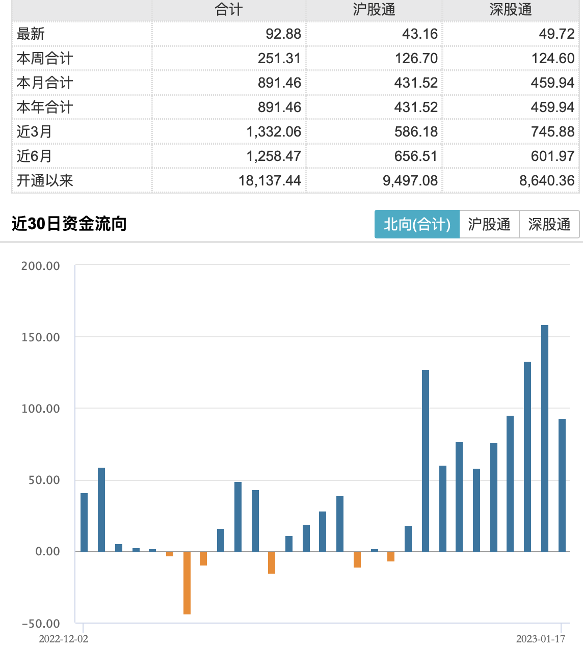 1月17日,A股三大股指涨跌互现,北向资金却继续净流入92.88亿元。其中,沪股通净流入43.16亿元,深股通净流入49.72亿元。