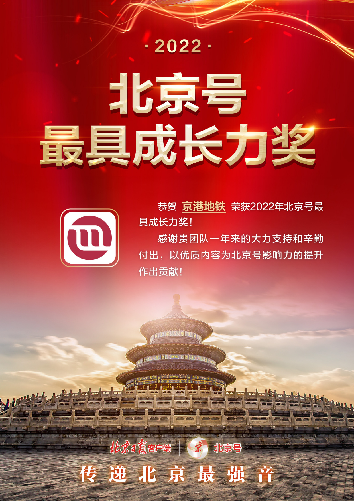 近日,京港地铁在北京号2022年度影响力奖项评选中,从360余家单位脱颖而出荣获“最具成长力奖”。其他获奖的单位还有北京人大、北京2022年冬奥会、北京市交通委员会、BRTV北京卫视等。