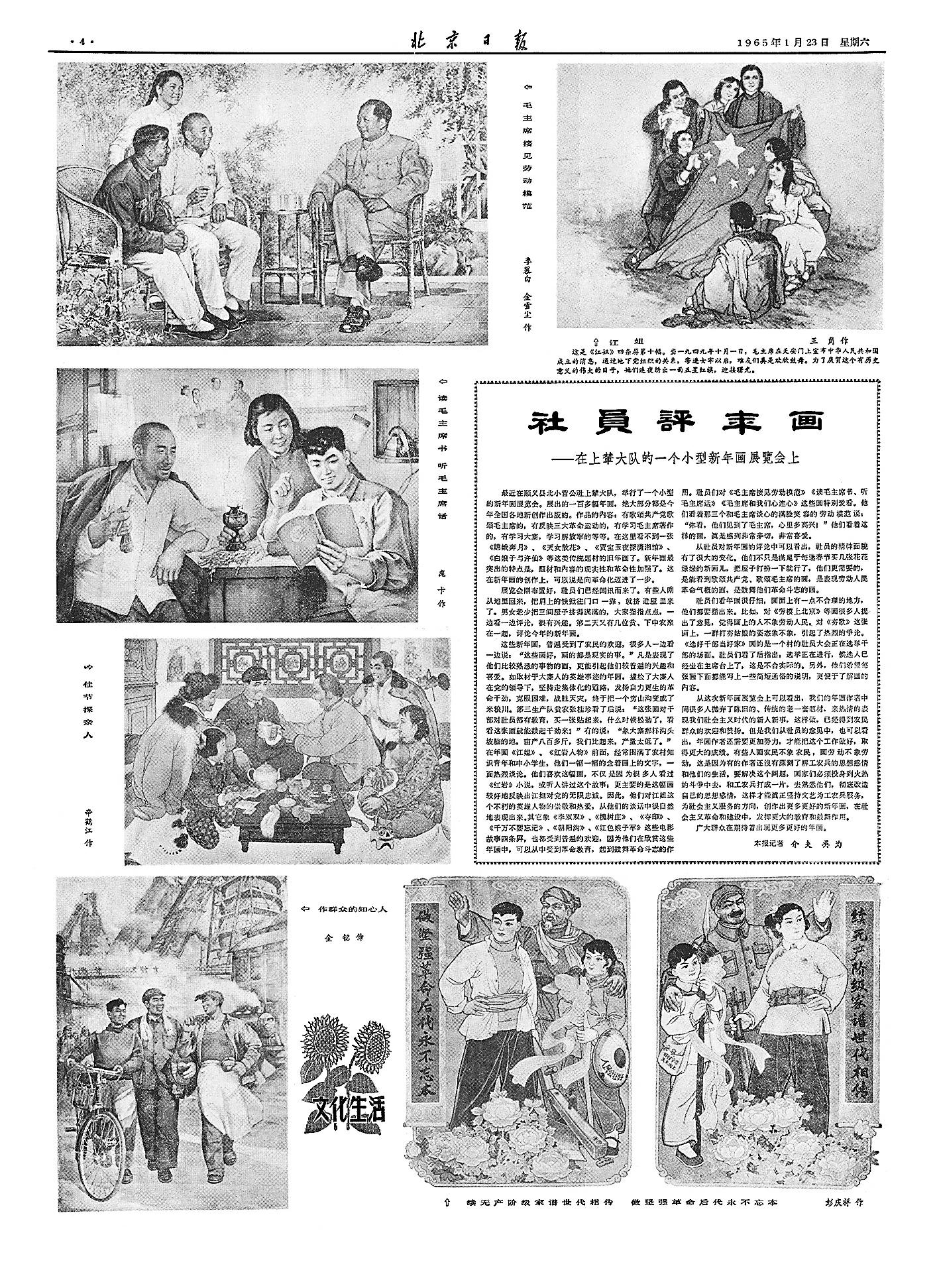 这些新年画,记录着社会的风云变幻,具有鲜明的时代特色,普遍受到了群众的欢迎,很多人一边看一边说:“这些画好,画的都是现实的事。”在年画《江姐》《红岩人物》前面,经常围满了农村知识青年和中小学生,他们一面一幅一幅地念着画上的文字,一面热烈谈论。人们在欣赏年画中,不只是满足于每逢春节买几张花花绿绿的新画儿、把屋子打扮一下就行了,他们更需要的,是能看到表现新时代的新人新事。(1965年1月23日《北京日报》4版,《社员评年画》)