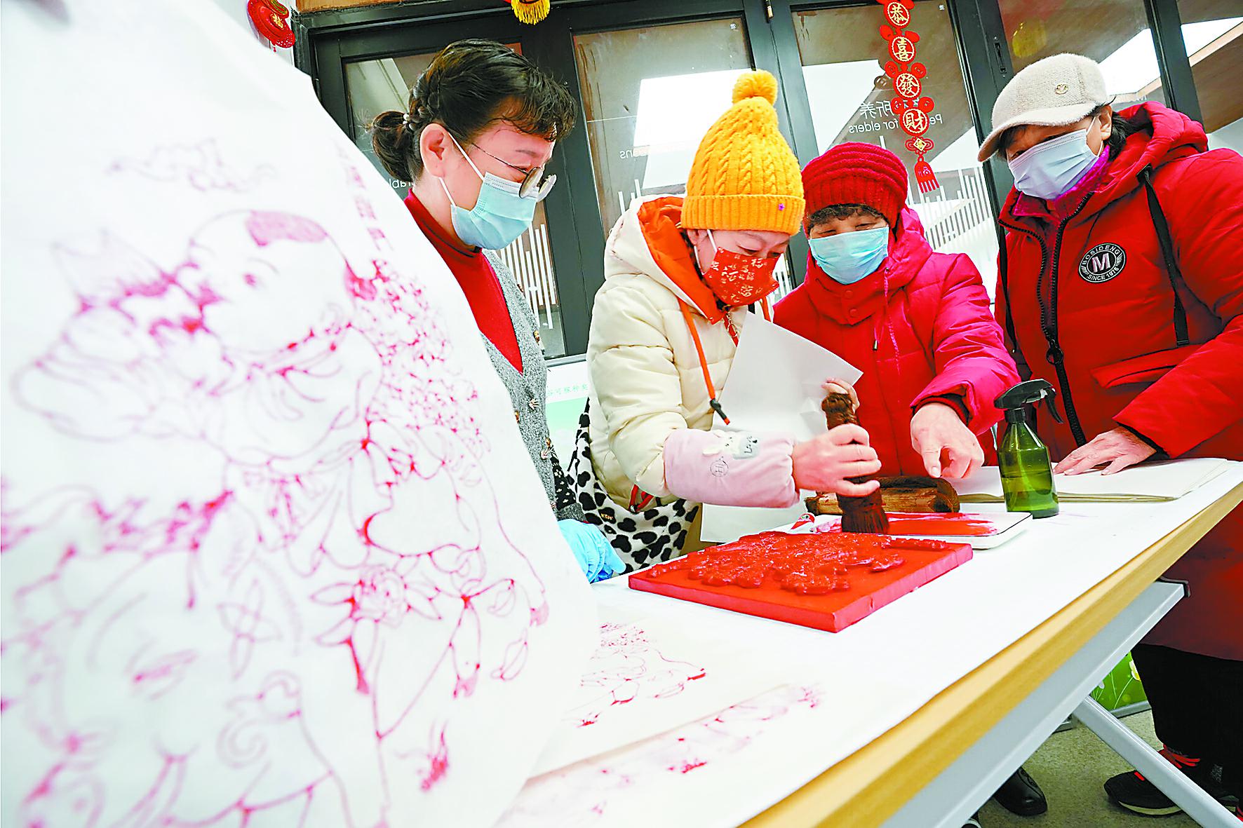 2021年2月3日,在什刹海街道兴华社区,居民在民俗协会老师的指导下制作木版年画。 方非摄