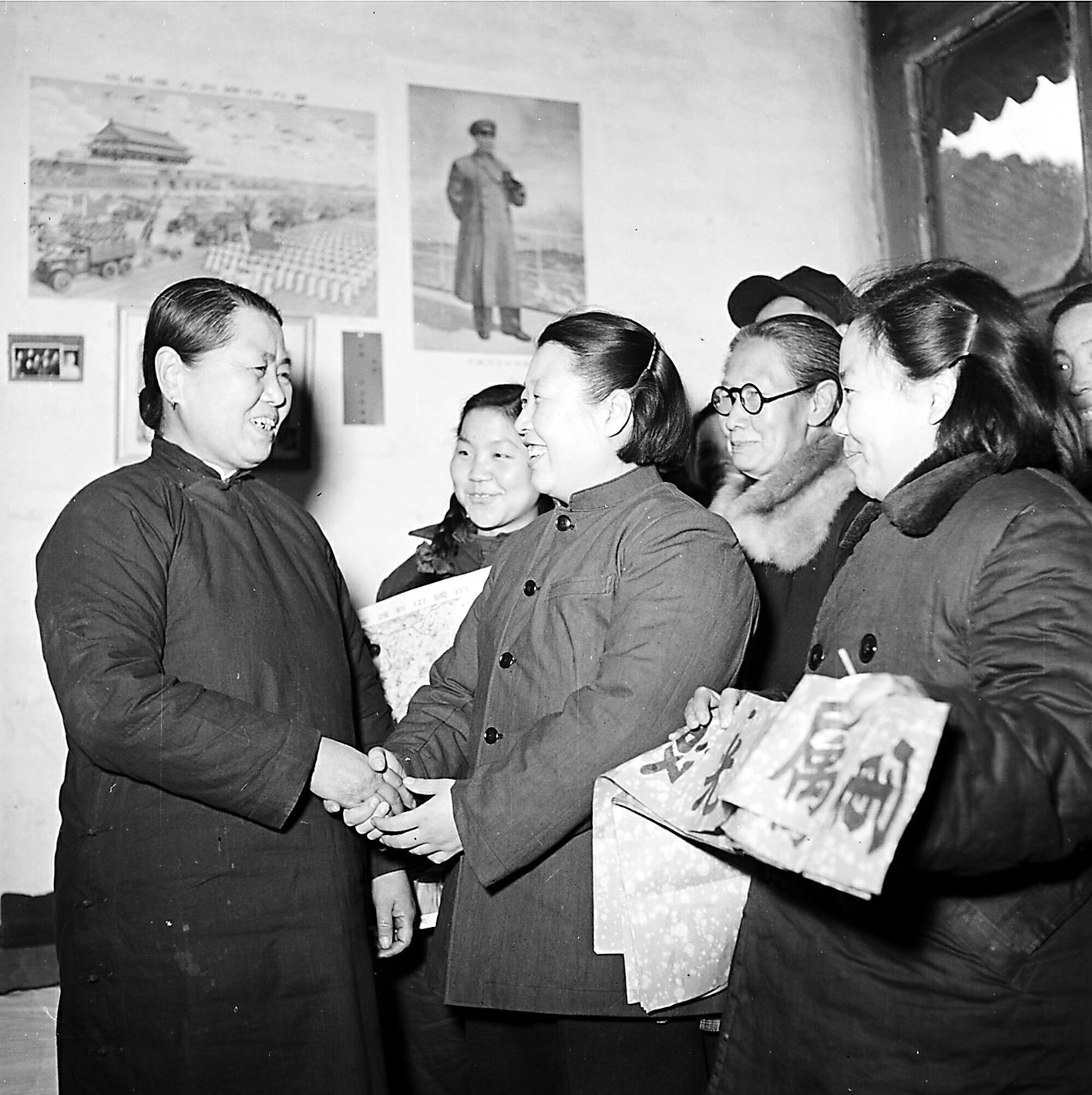 1956年2月1日,西单区油房胡同居民委员会主任白秀文和委员们到军属李春奎老太太(左一)家去慰问,并送上春联和年画。李祖慧摄