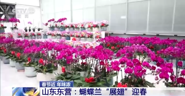 山东东营黄河口兰花谷里的150多种蝴蝶兰竞相开放,喜迎新春。漫步其中,温暖如春的温室与外面的寒冷天气形成鲜明对比,各种绚丽的色彩让人赏心悦目。蝴蝶兰也叫幸福兰,寓意幸福向你飞来,喜气十足,吸引了不少市民前来购买。