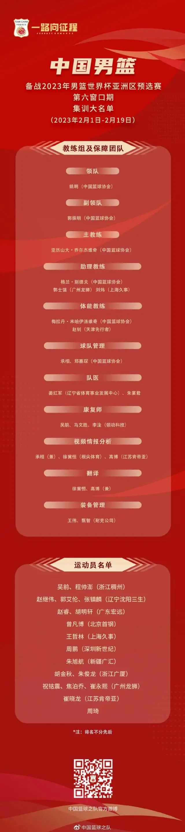 19日上午,中国篮协公布了世预赛第六窗口期中国男篮集训大名单。在这份18人名单中既包括联赛当中的名将像赵继伟、郭艾伦、赵睿等,还有年轻球员曾凡博、崔晓龙、崔永熙、焦泊乔。中国男篮在为未来的人才建设进行考虑。