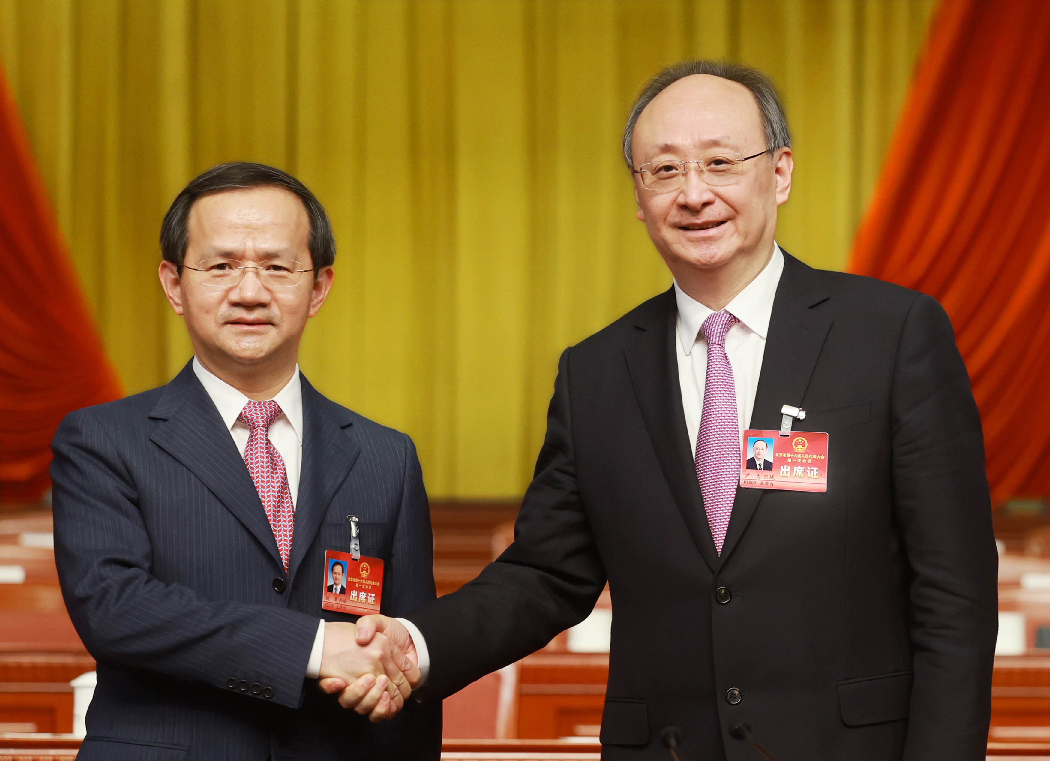 市委书记尹力与新当选的市长殷勇(左)紧紧握手,表示祝贺。