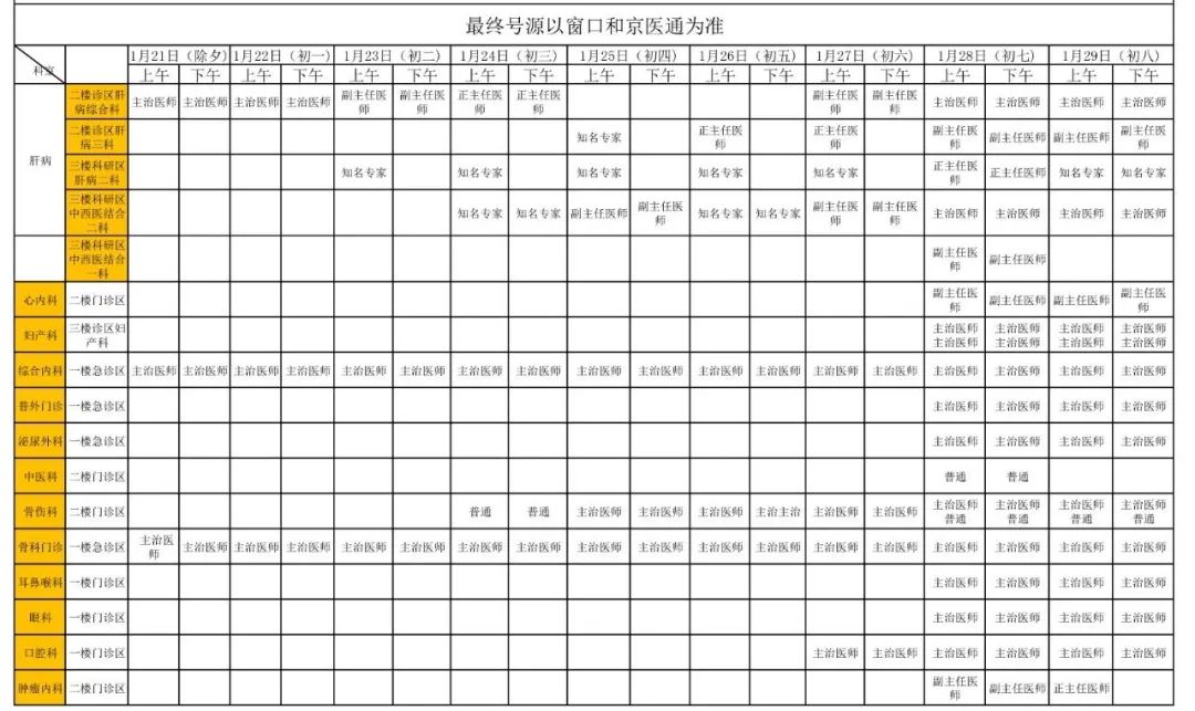 (4)中西一科:1月21日、22日上午半日专家门诊,1月23日-27日全天专家门诊。