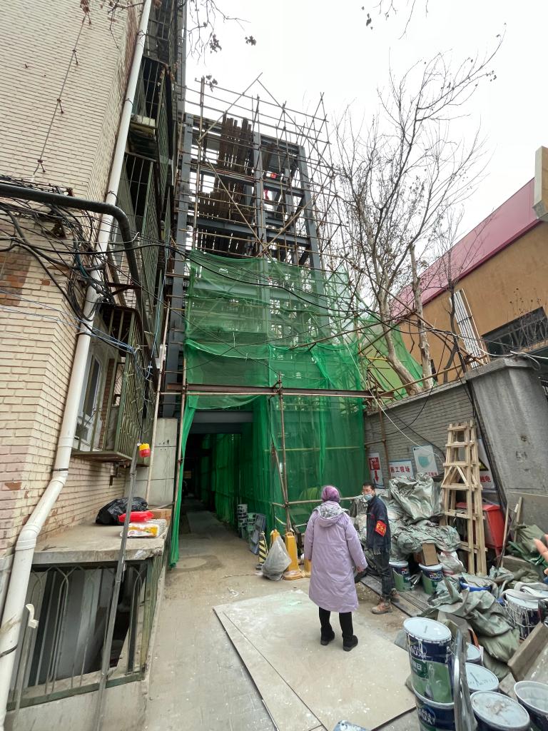 图为里仁东街小区5号楼加装电梯现场。(受访者供图)
