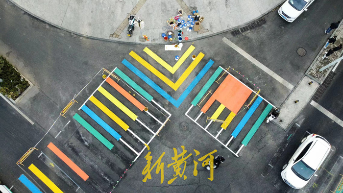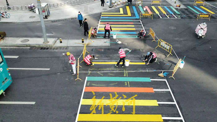 1月19日,在西客站片区的腊山河东路与兴福寺路交叉口处,工作人员将原来的白色斑马线铲除后,开始手工施划彩色斑马线,颜色以绿色、蓝色、黄色、红色、橘色为主,打造色彩斑斓的彩虹斑马线,远远望去,仿佛是铺设在路面上的彩虹。