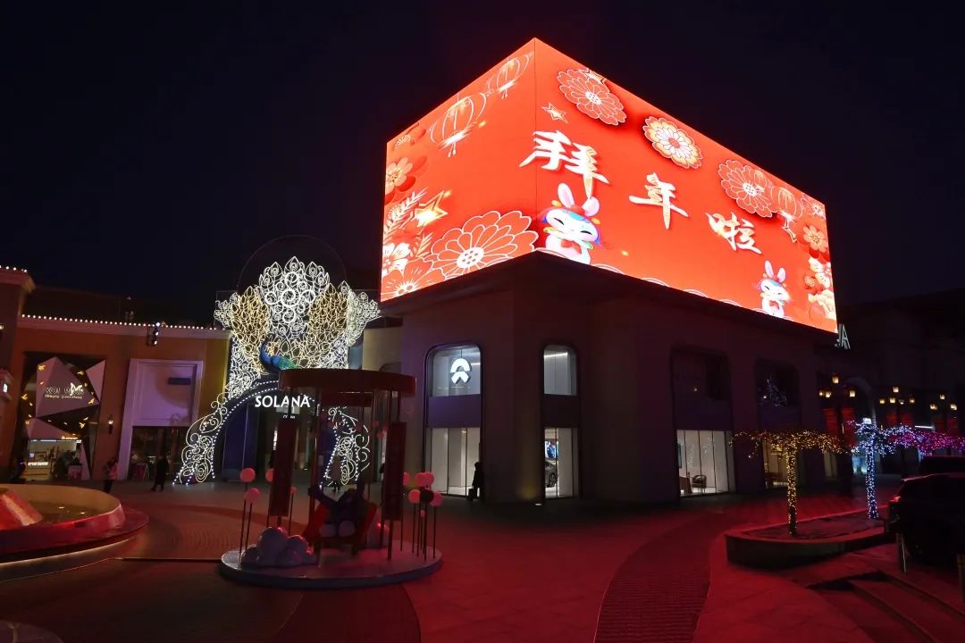 在世贸天阶,巨型电子屏上蹦出可爱的福兔、祥云、灯笼与烟花托出主题文字,从“恭贺新春”开始,分多个板块展示阖家安康、兔年大吉、花开富贵、祝福祖国、繁荣昌盛等主题内容,为小街增添一份年味儿。