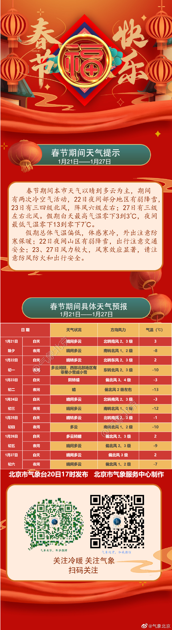 春节期间(1月21至27日)本市天气以晴到多云为主,期间有两次冷空气活动,22日夜间西部、北部地区有零星小雪或小雪,23日有三四级北风,阵风六级左右;27日有三级左右北风。假期白天最高气温零下3到3℃,夜间最低气温零下13到零下7℃。期间总体气温偏低,体感寒冷,外出注意防寒保暖;22日夜间山区有弱降雪,出行注意交通安全;23、27日风力较大,风寒效应显著,请注意防风防火和出行安全。
