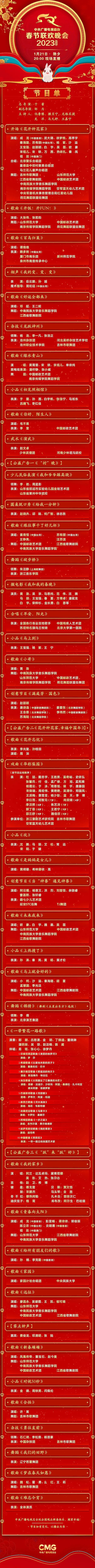 寅虎辞旧岁,卯兔报春来。突显“欢乐吉祥、喜气洋洋”总基调,中央广播电视总台《2023年春节联欢晚会》节目单正式发布。