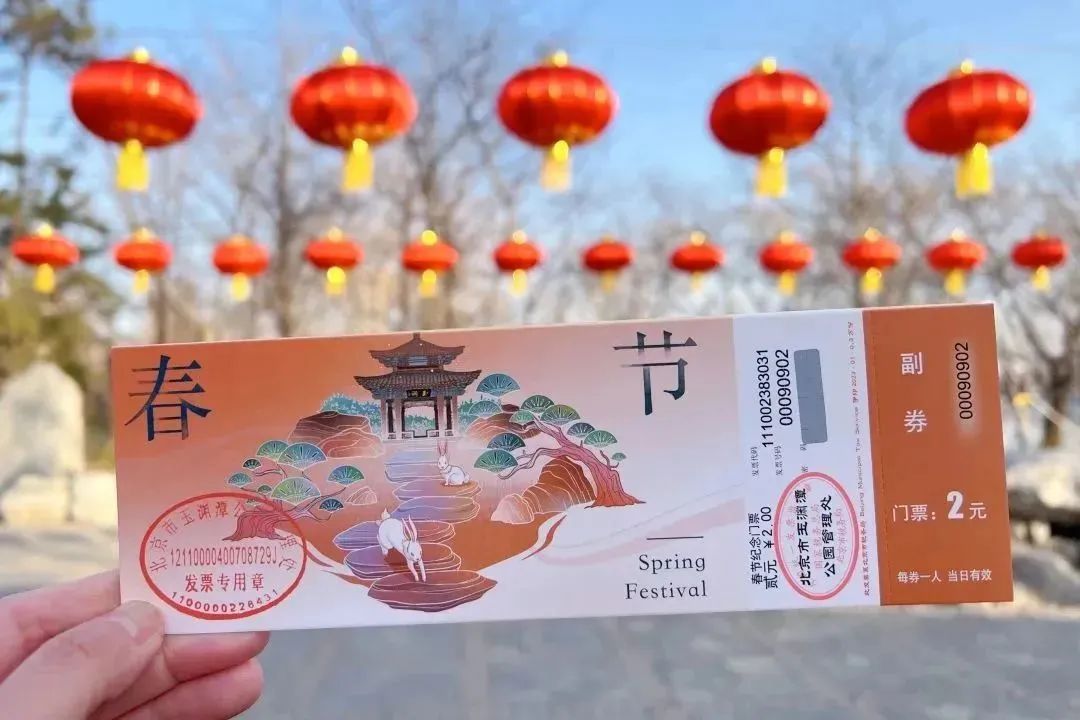 1月22日初一当天早6点起,公园将在各门区发售“我们的节日”春节纪念版门票。文创门票整体采用国风写实风格,描绘了玉渊潭公园玉渊亭的古朴之感,融入兔年生肖跃动画中,寓意兔年吉祥,展现喜庆祥和的公园美景,同时将传统节日与玉渊潭公园特色风景建筑巧妙融合,别出心裁,对收藏感兴趣的游客朋友千万不要错过啦!