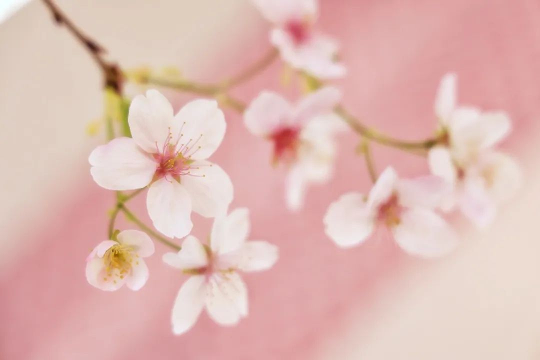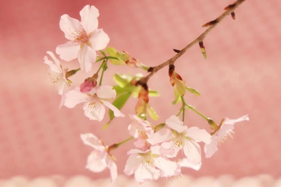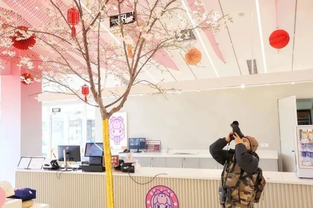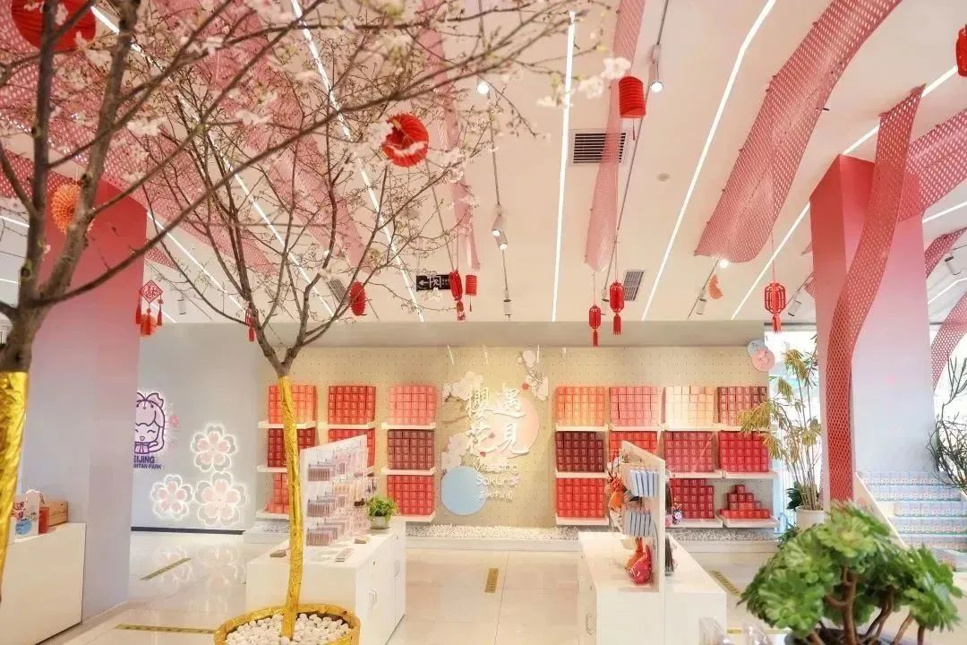 一朵朵淡粉与紫红相间的花朵犹如铃铛悬满枝头,喜气十足,与店内活泼温暖的粉白色主题相映成景,让每一位步入店内的游客朋友带来视觉+购物的双重体验,同时感受春的气息。