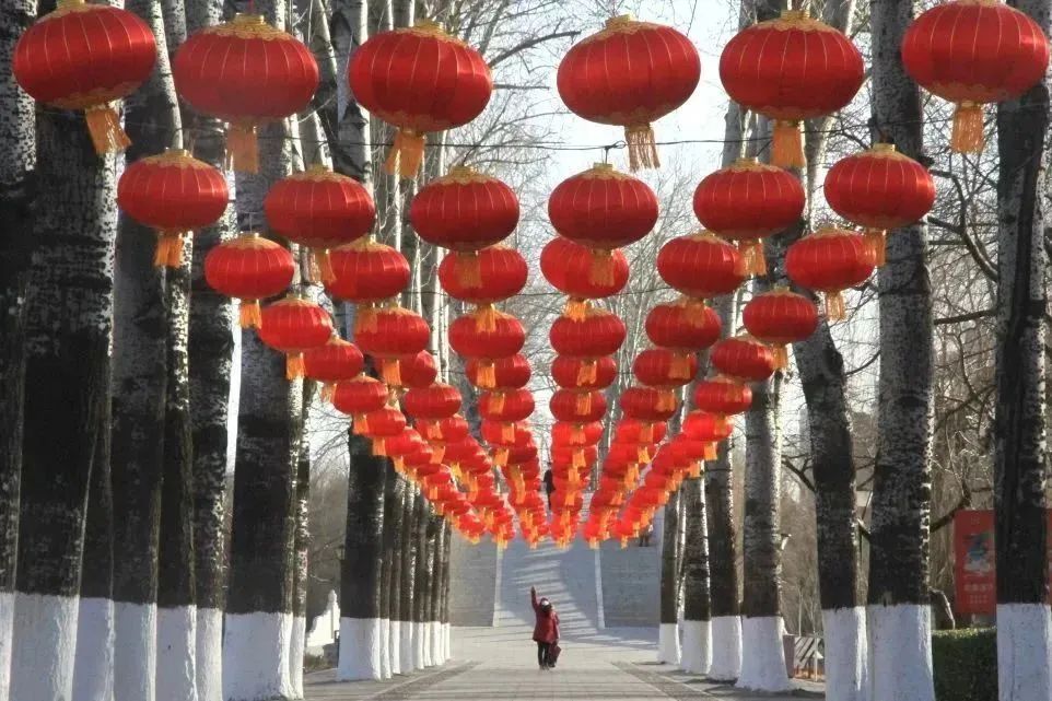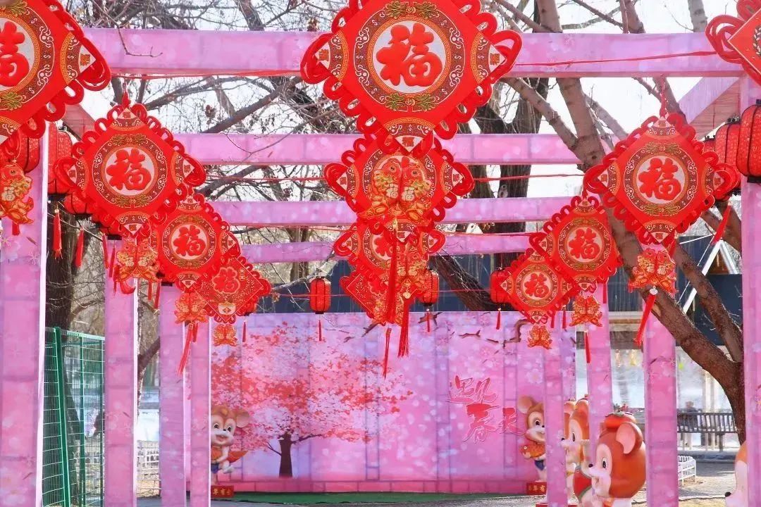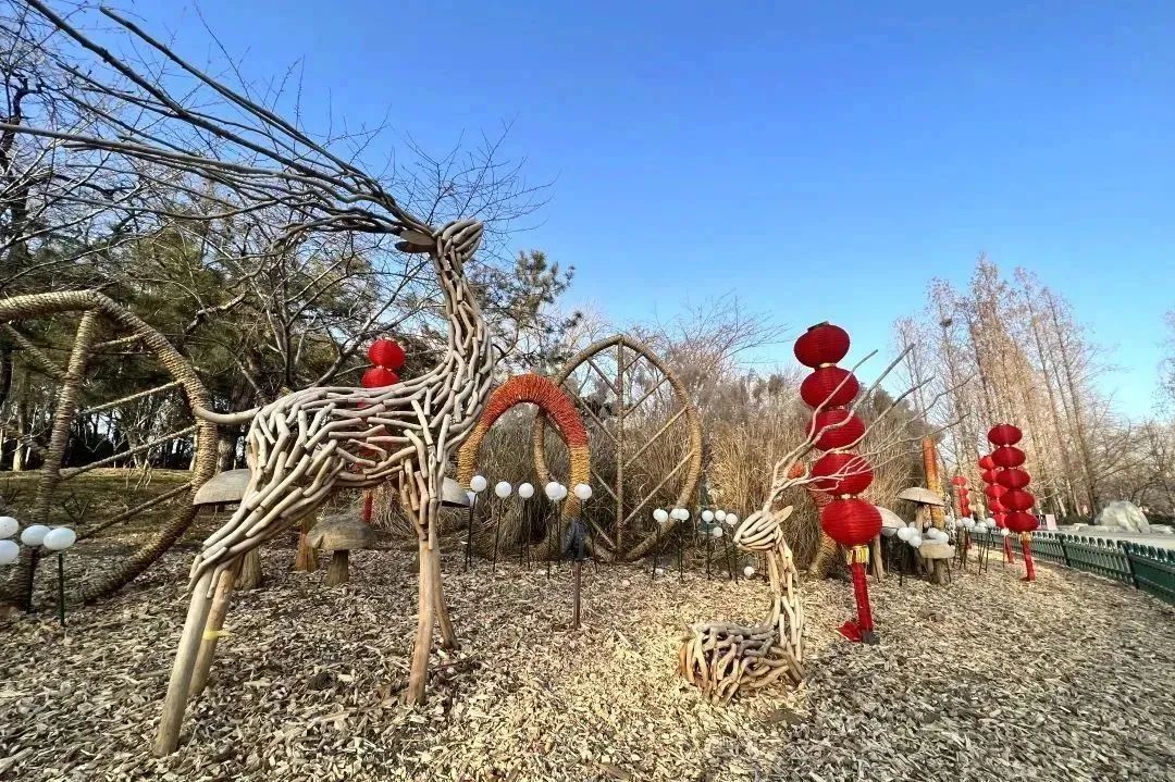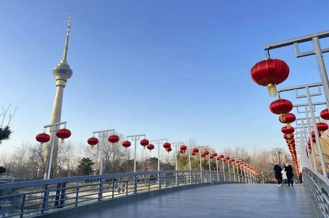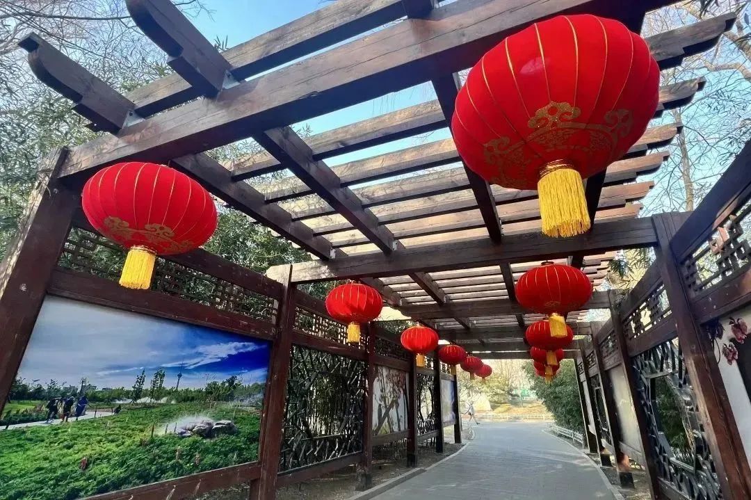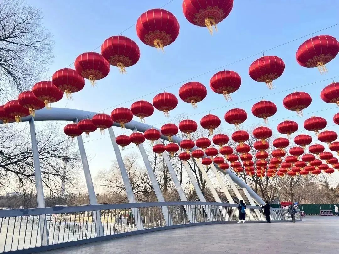 1800只大红灯笼高高挂起在公园各大门区、中堤桥、西门桥、冰雪季活动区及道路沿线、建筑物等处,福字、冰糖葫芦串灯等节日氛围装饰品配以园内特色景观建筑,营造出喜气洋洋的新年氛围。