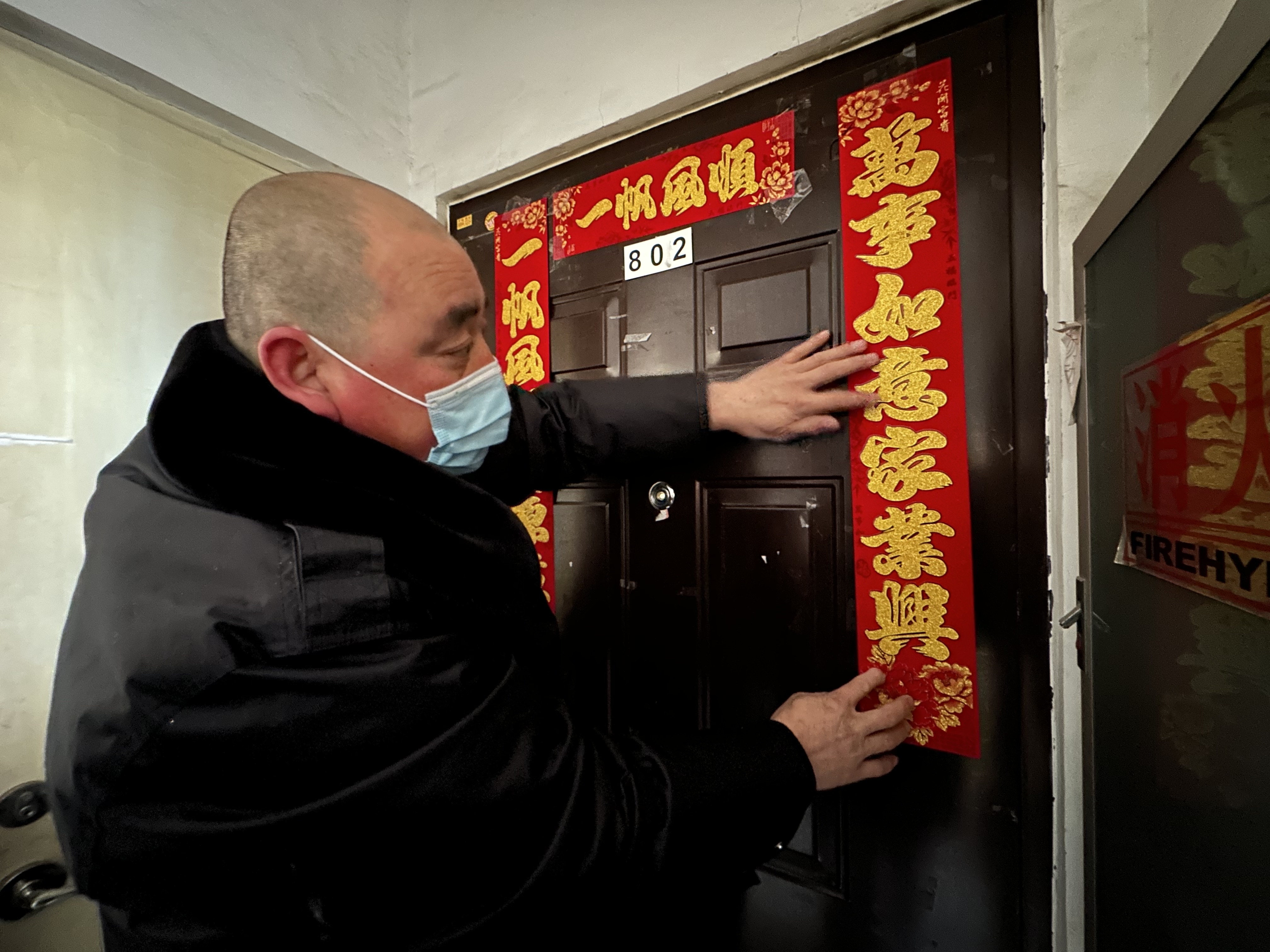8时许,物业工作人员庞占凯和姚明月来到8号楼一户居民家门前,先将门上的旧春联摘下,将残留的胶印铲掉,再用抹布仔仔细细地把大门擦干净。“来!帮我看看春联的位置正不正?”“左边再往上一点。”两人配合默契,很快就将一副新春联贴好了。“这户居民因为工作原因,已经好几年没回老家过年了。今年难得放假,提前回家看望老人去了。”姚明月说,等他们过完年一回北京就迎门见喜,心里肯定很高兴。
