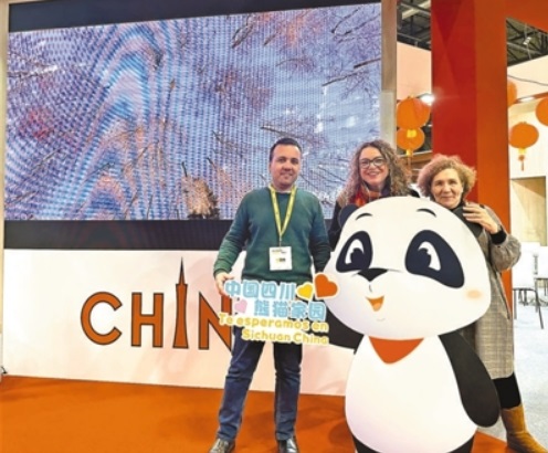2023年马德里国际旅游展参展各方热切期待中国游客到来。图为在中国展台,观众与熊猫立牌合影留念。图源:人民日报