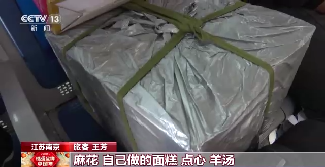 旅客 王芳:麻花,自己做的面糕、点心、羊肉汤。她嫁到那边好久没有回家了,让她尝一尝家乡的味道,家人特别想她。