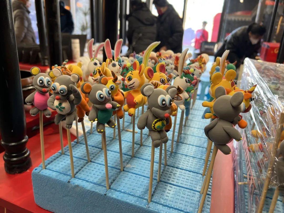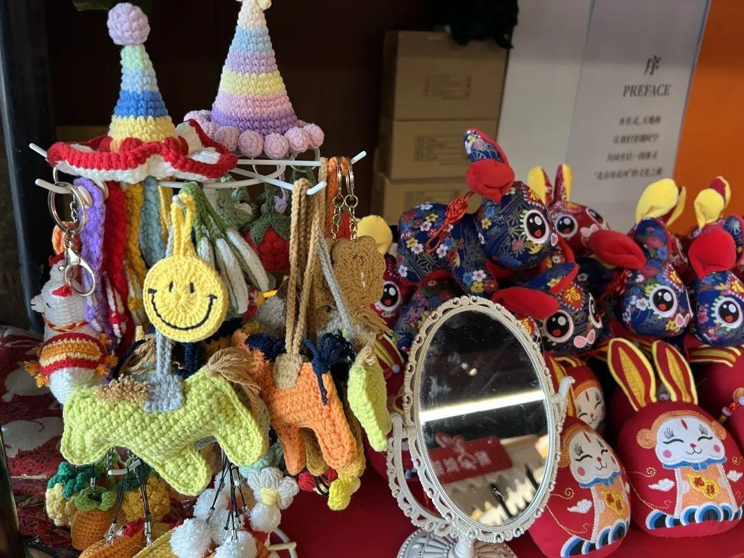 在瞭仓艺术馆文化市集里,既有糖画、泥塑、剪纸等非遗手作活动,也有扭扭棒、耳环、手工花灯等潮玩手办,香水、饰品、新年钥匙扣等文创周边,更是得到不少小姐姐们的青睐。