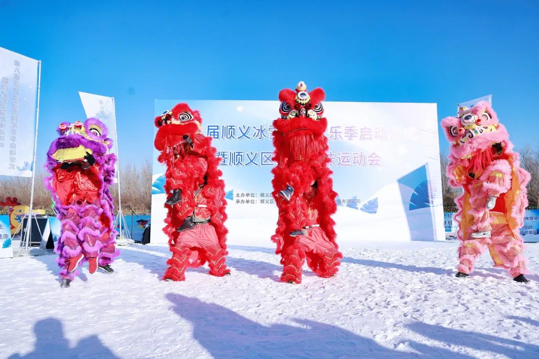 开场仪式上,舞狮团带来了精彩的暖场表演——《瑞狮迎春》,用铿锵有力的舞狮表演带领现场观众走进冰雪盛宴。伴随着雪地龙舟团体项目鸣锣开赛,本届冰雪趣味运动会拉开帷幕。