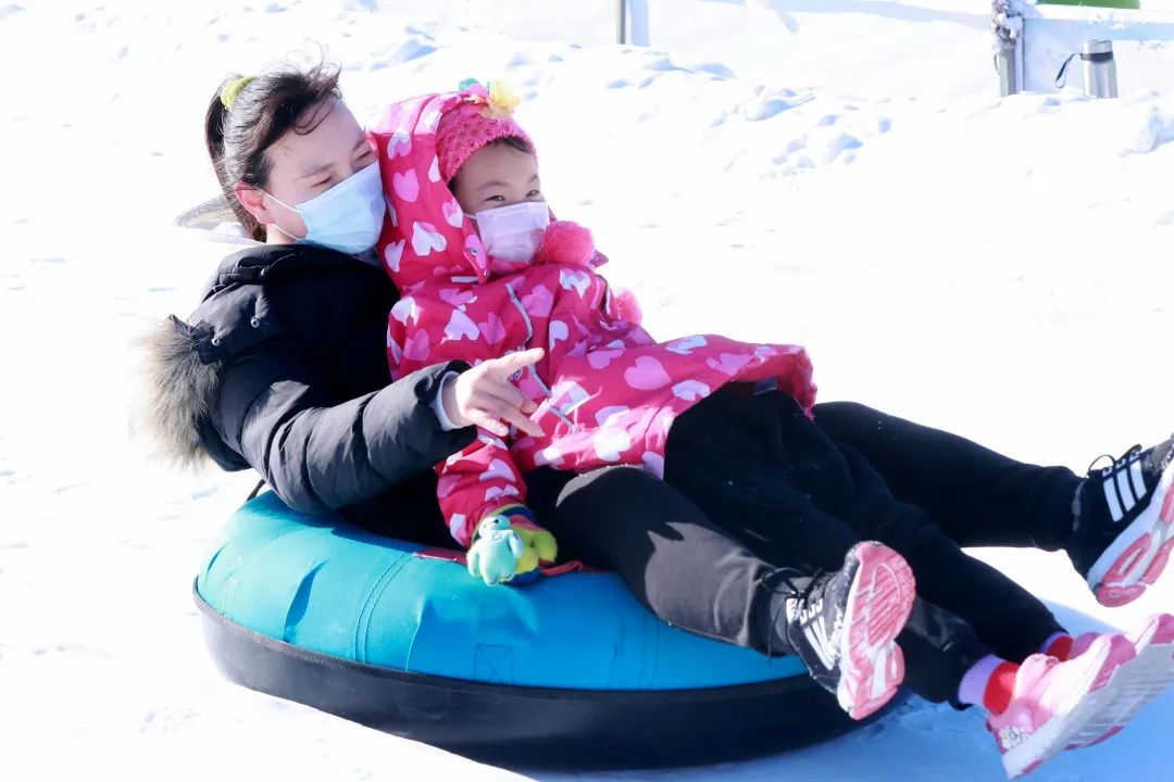 家长与孩子一同体验雪圈竞速项目。