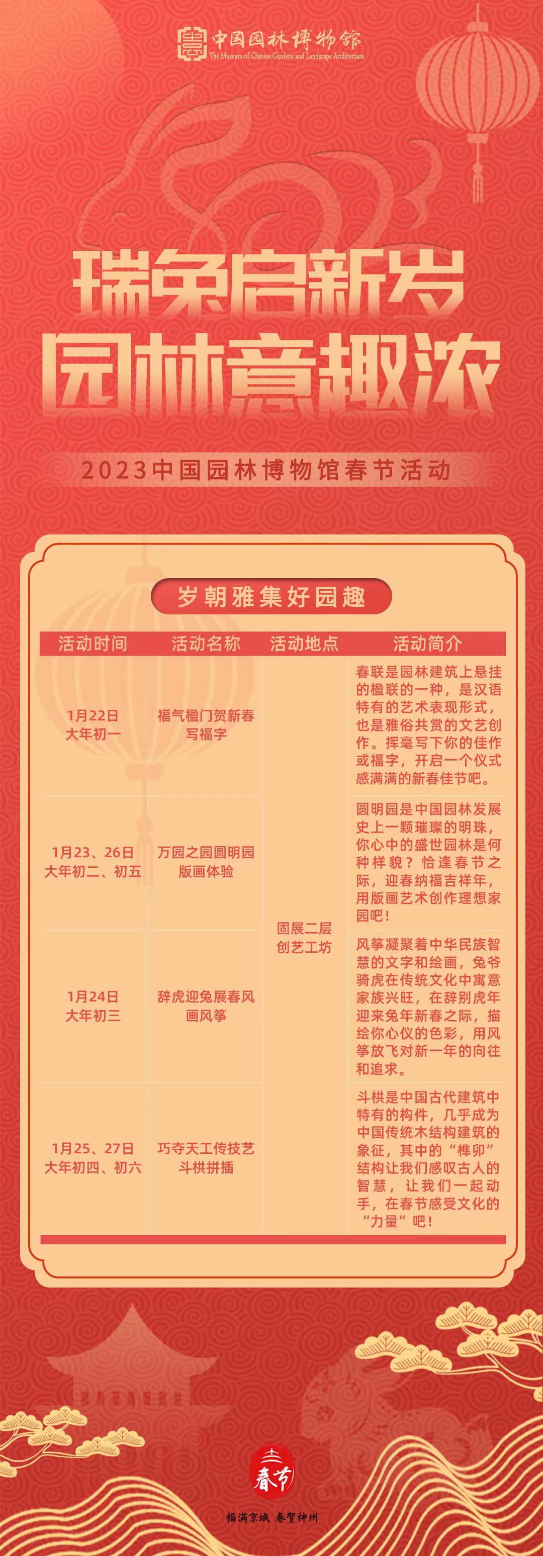 漫步在中国园林博物馆中,一切光景皆有一种节日的欢乐情调。深冬的热闹团聚与古老的传统岁时产生共鸣,流传千年的文化节俗,将馥郁的新春喜气洒满园林。