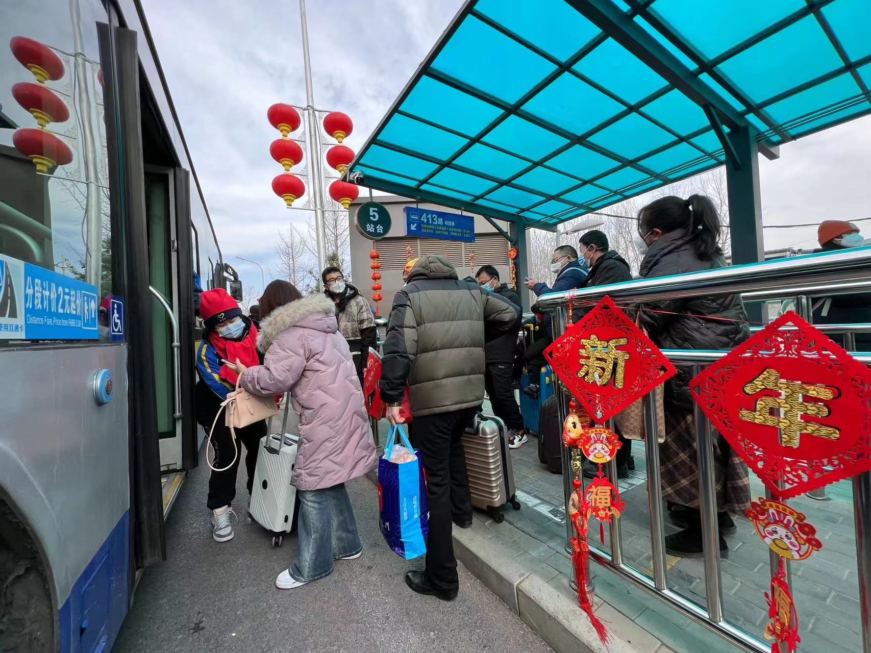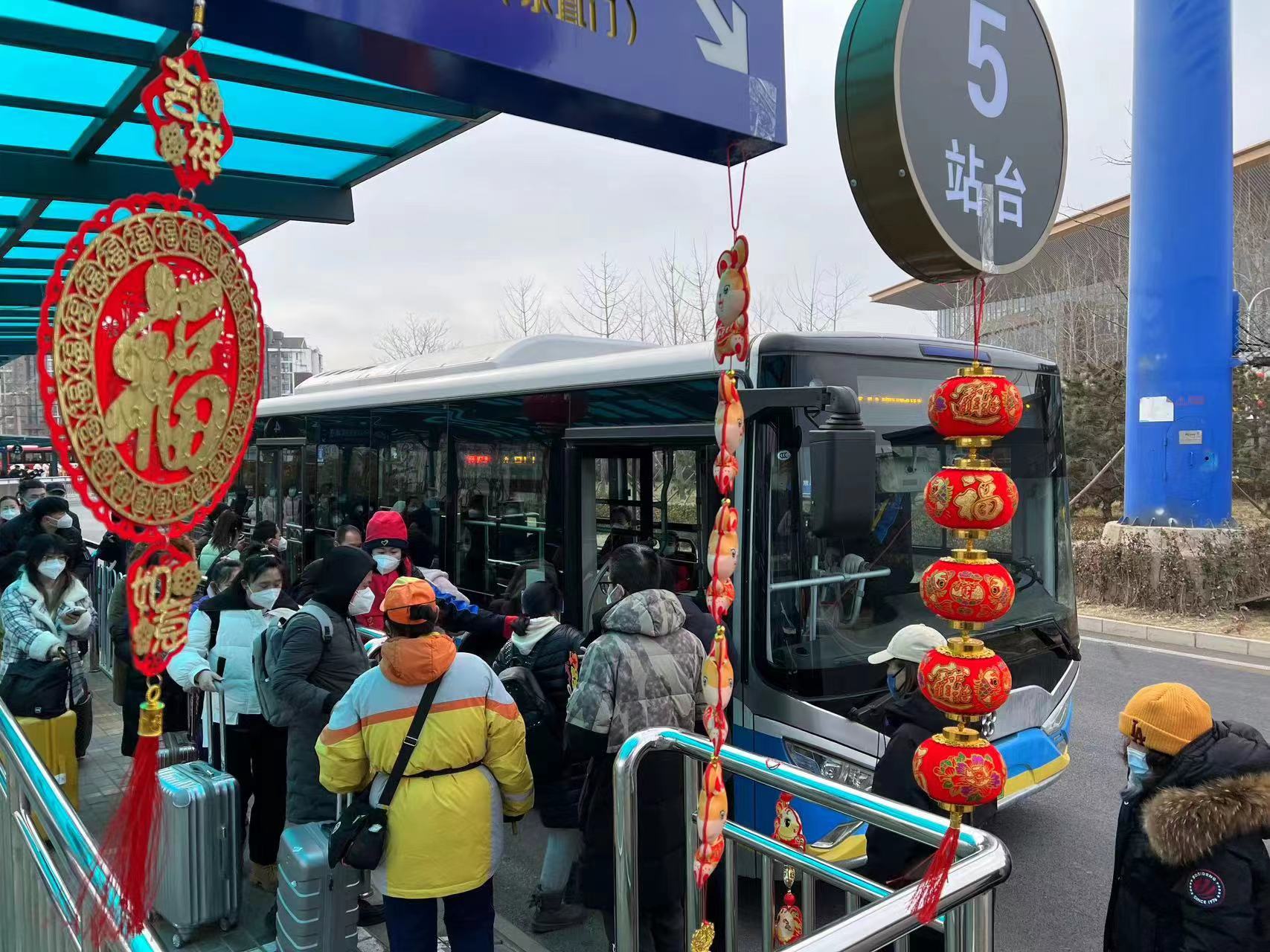大年初五,413路北京朝阳站站台挂着火红的灯笼和拉花,迎接着返京的乘客。针对北京朝阳站至10号线燕莎桥东站、14号线东风北桥站、朝阳公园站接驳需求量较大情况,北京公交集团客二分公司增加了地铁摆渡车次,制定了一站直达的区间调度措施,提高运营效率,减少旅客候车及换乘时间。413路、专195路、专194路车队组织公交青年志愿者加入到站台秩序维护工作中,指挥车辆规范进出站,引导乘客安全登乘,耐心解答乘客咨询,协助引导疏散乘客。