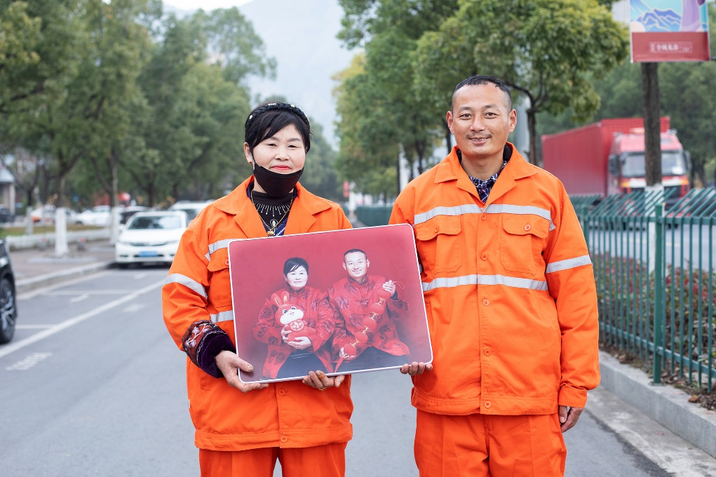 王敏智是黄岩当地的一名摄影师,今年也是他第3年为环卫工人夫妇拍摄新年夫妻照。王敏智说,平时看到环卫工人在街头巷尾打扫非常辛苦,而且自己也了解到,很多环卫工人连续多年没有回老家过年了,于是就想到用手中的镜头为他们拍一些喜庆的新年照片,定格别样的美丽,也当作是送给他们的新春礼物。