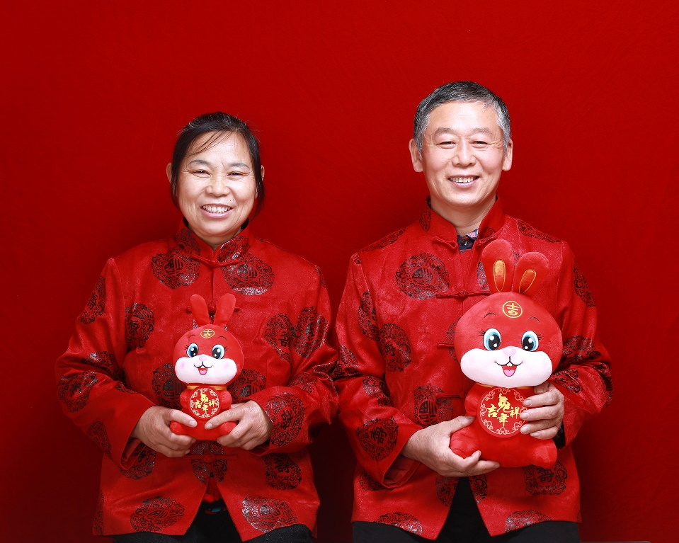 照片里,两人身着唐装,手拿兔年吉祥物,满脸笑意,充满了节日的氛围感。接过照片的这一刻,夫妻俩疲惫的脸上瞬间露出了笑容。