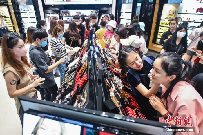 1月22日,正值中国农历正月初一,顾客在cdf三亚国际免税城选购化妆品。据了解,春节假期期间,海南各免税店针对离岛旅客制定了一系列优惠活动,吸引游客入店消费。 中新社记者 骆云飞 摄